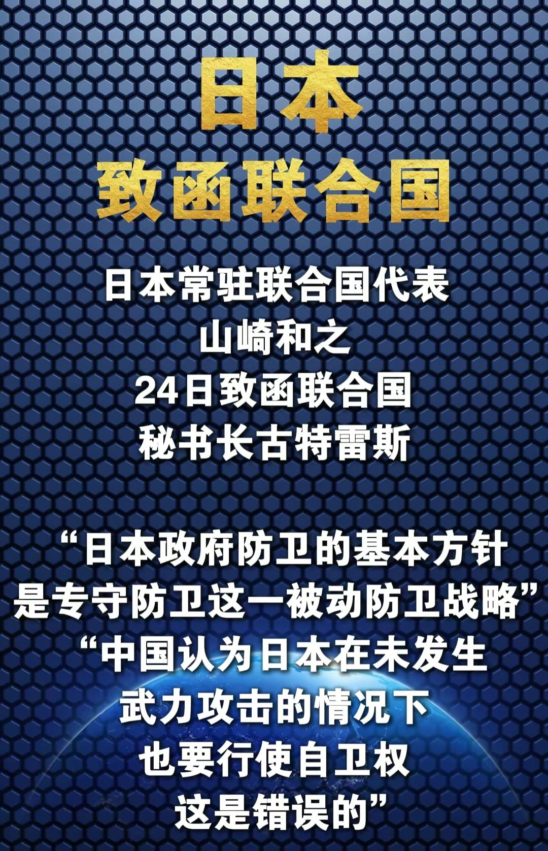 日本致函联合国,属于恶人先告状,日本向联合国投诉,“中国认为日本在未发动武力攻击的情况下,中国也要行使自卫权”,日本似乎忘记曾经自己是战败国,他们也忘记了,这是国际法赋予中国的权利,只要日本有军国主义苗头,中国就有权利进行先行打击。