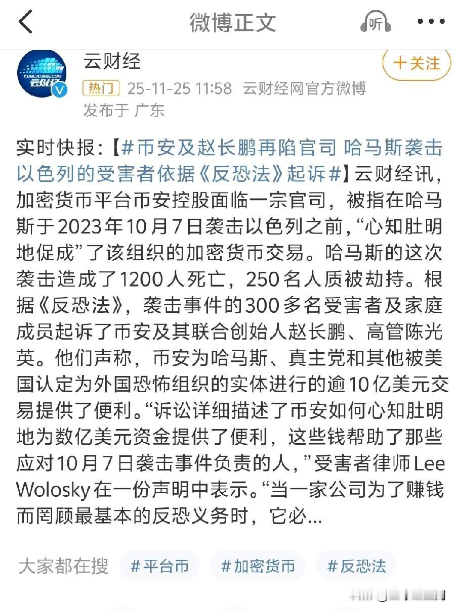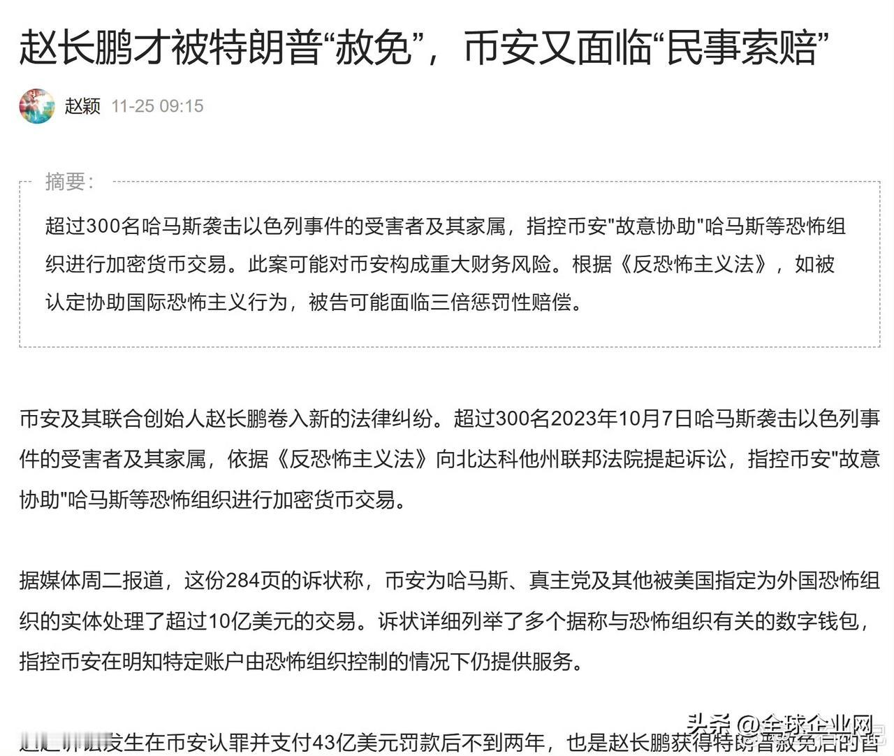 赵长鹏麻烦大了,涉嫌给哈马斯恐怖分子提供资金。