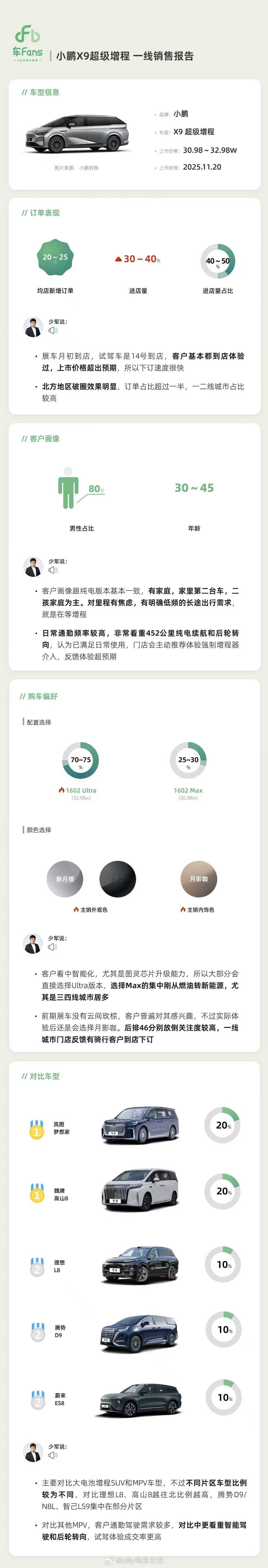 小鹏X9超级增程现在定车要等5-7周?不是有网友说订单不如预期吗?建议去门店自己了解一下,确实是订单很多!从托马斯的微博看,北方的订单量涨得最多!合理!原本很多北方的朋友不敢买纯电也是因为地域关系,加上很多电车都是后驱的,冰雪路面会打滑,虽然X9超级增程也是后驱,但针对北方用户的痛点做了针对性优化,就是后驱也能如履平地!这也是小鹏X9超级增程卖得好的原因吧,找到意向客群的用车痛点,解决这些痛点,他们自然就会下单了。小鹏高管曝X9超级增程北方多地订单翻倍