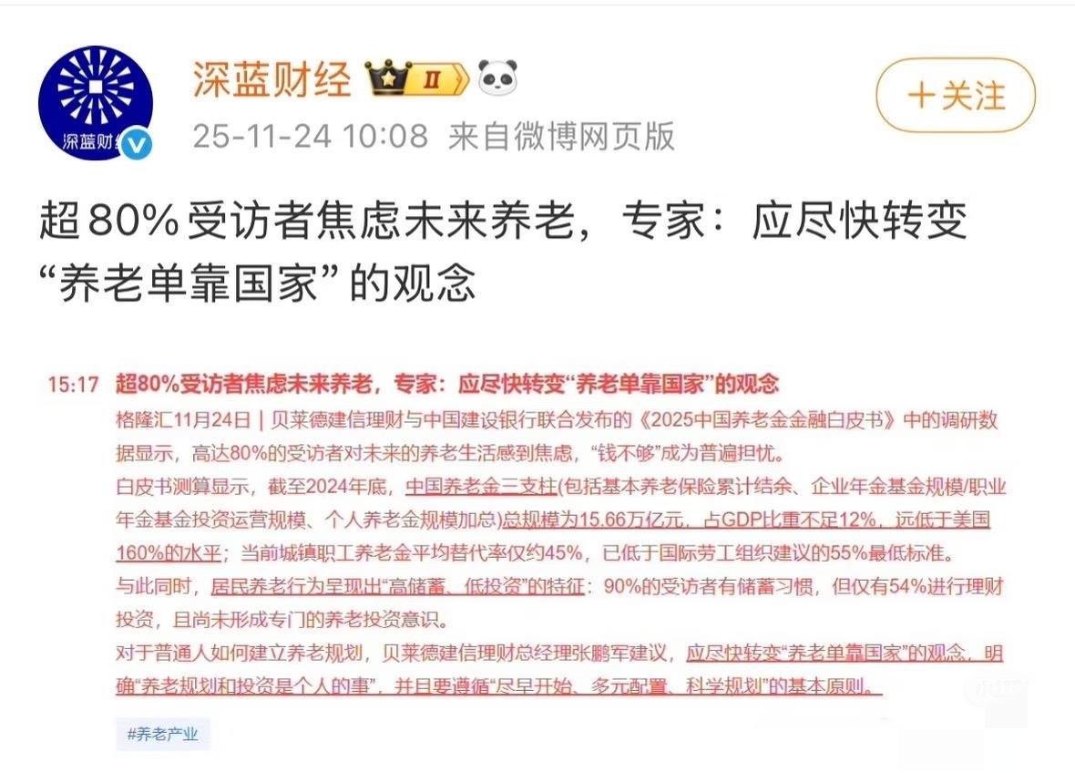 尽快转变“养老靠国家”的观念。 《2025中国养老金融白皮书》调研数据显示超80%受访者焦虑未来养老,专家:应尽快转变“养老靠国家“的观念。 可是年轻人在年轻的时候用养老金哄自己上班吃苦不躺平,退休该躺平的时候又该靠自己养老了,我的养老金都去哪了。