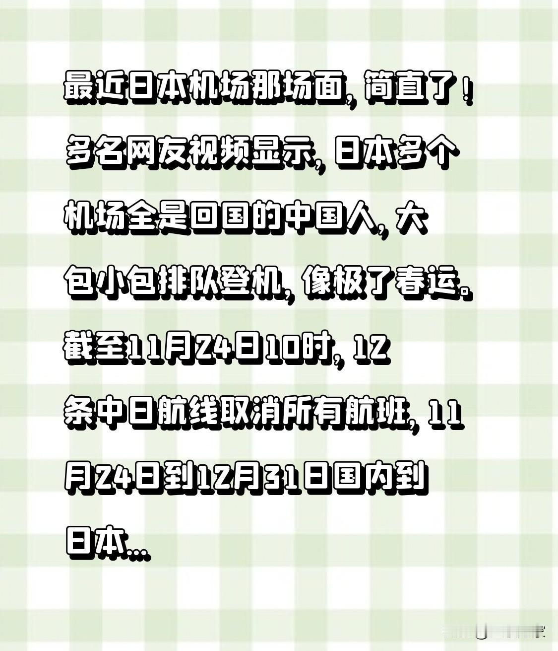 最近日本机场那场面,简直了!多名网友视频显示,日本多个机场全是回国的中国人,大包小包排队登机,像极了春运。截至11月24日10时,12条中日航线取消所有航班,11月24日到12月31日国内到日本计划航班取消量同比上月增约56%。国航也对部分航线进行调整,像上海浦东—大阪关西航线就有变动。 有游客航班满座,还有人因家人担心安全提前回国。这背后到底发生了什么,让这么多人归心似箭?是安全因素,还是其他隐情?大家怎么看这一现象?你身边有从日本提前回国的人吗?你觉得后续中日航班走势会怎样? 日本机票 中日航班量下降 直飞日本 大连日本航班 日本机场快线 中转日本 国航日本航班 普通人来日本 日本游客 直飞日本 日本回国指南 大连日本航班 日本机场快线