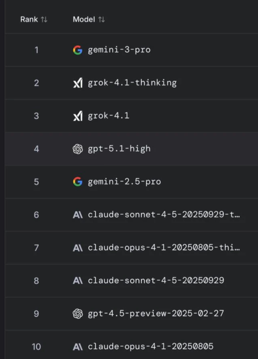 马斯克官宣,Grok 4.1-Thinking已经杀到LMARENA榜单第2名,目标1月前拿下榜首。现在Grok紧咬谷歌Gemini 3 Pro,把GPT-5和Claude都甩在身后。Grok能不能如期登顶,1月见分晓了。
