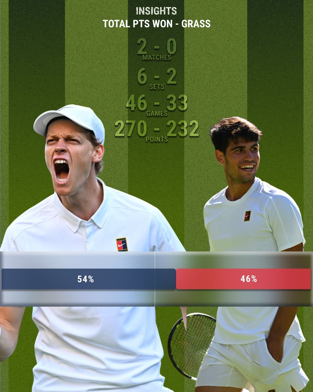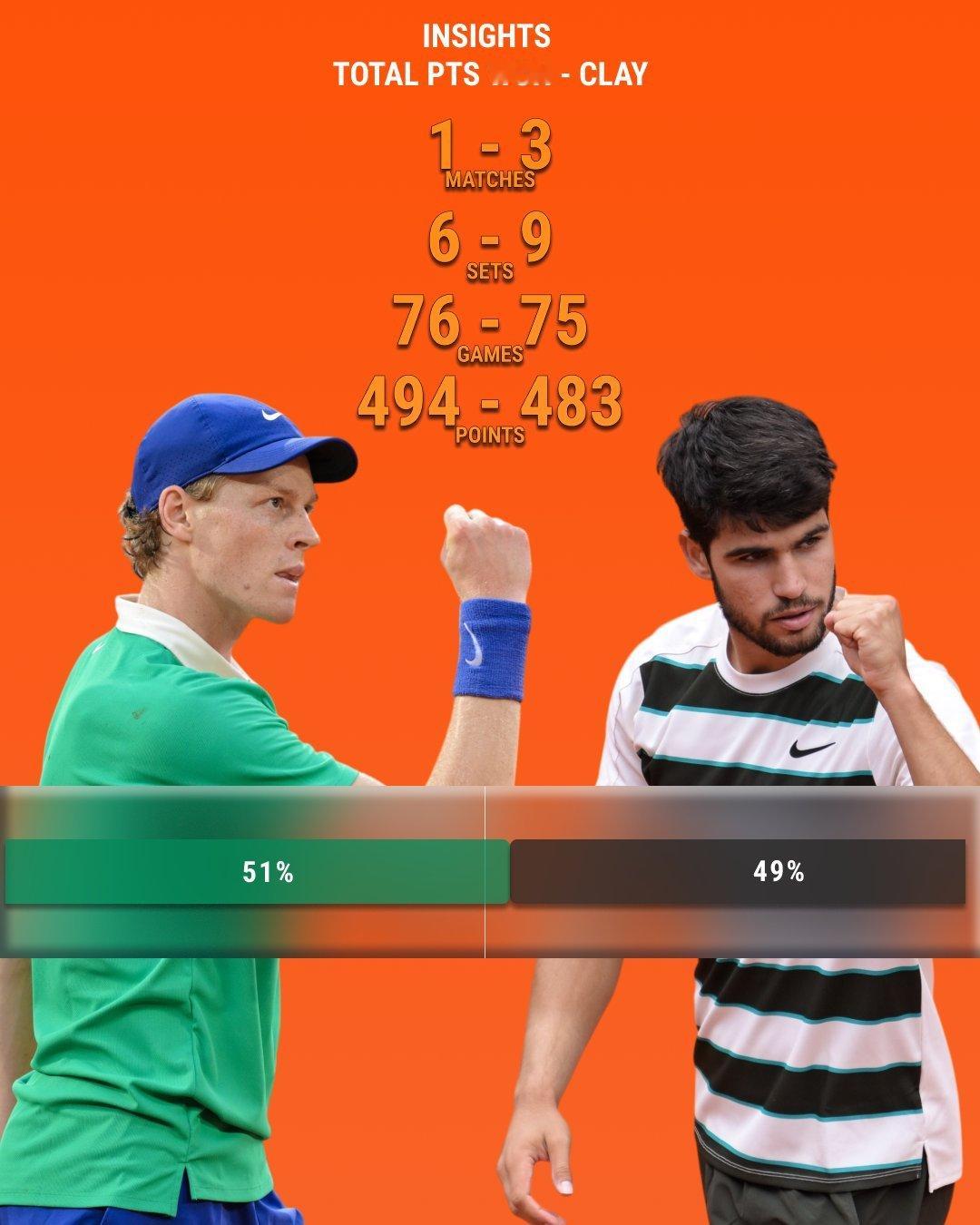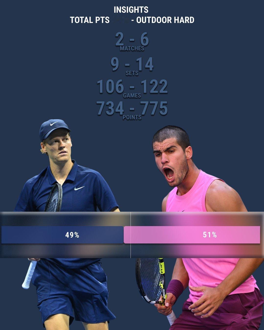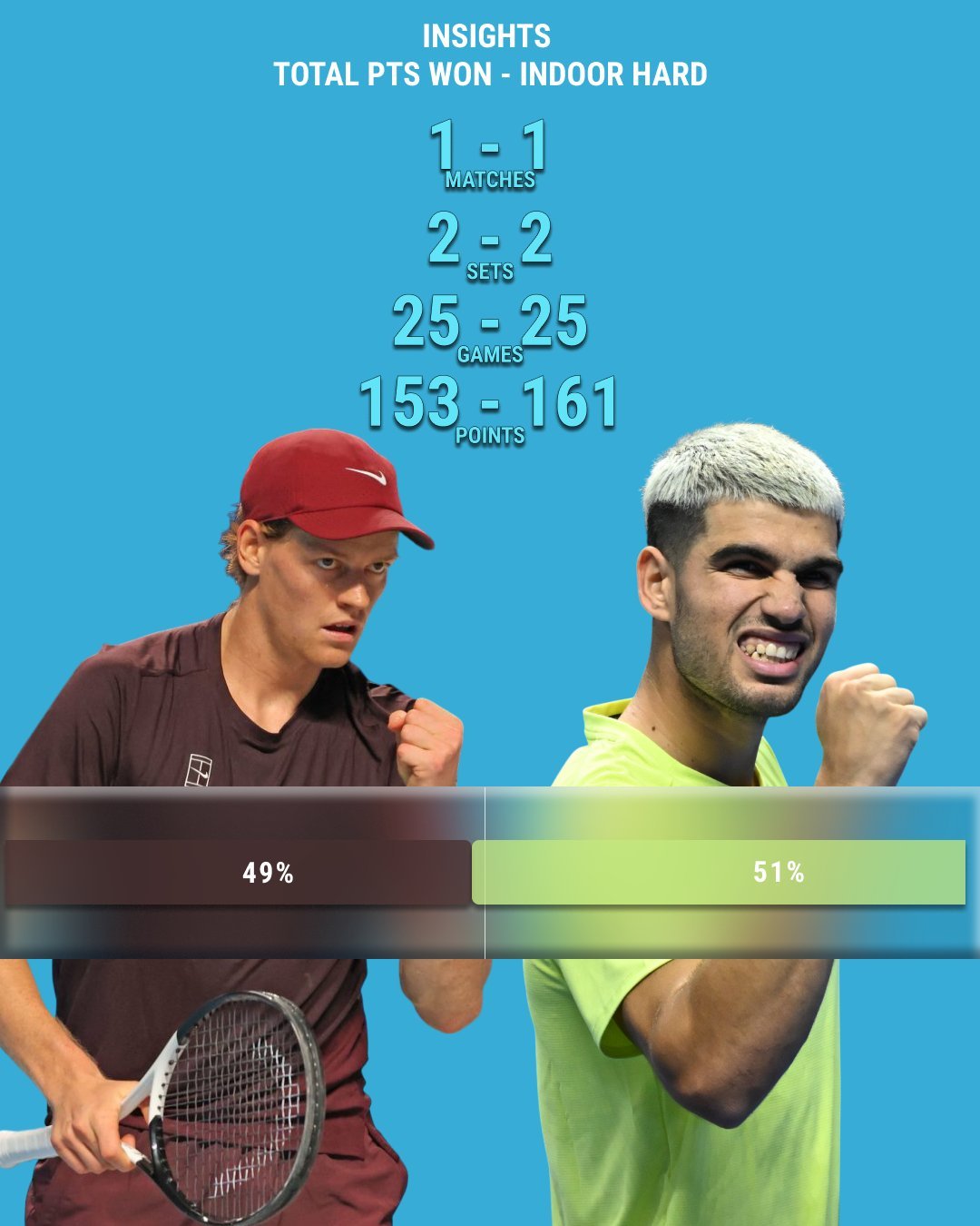 阿卡辛纳16次交手,正好都得了1651分。阿卡赢了10场,27盘,255局;辛纳6胜,赢下23盘,253局。【红土】阿卡3-1,盘数9-6,局数75-76,得分483-494(后两项辛纳领先)【室内硬地】胜负1-1,盘数2-2,局数25-25,得分阿卡161,领先辛纳153分【室外硬地】阿卡6-2,盘数14-9,局数122-106,得分775-734【草地】辛纳2战全胜,盘数6-2,局数46-33,得分270-232从数据看,阿卡在室外硬地优势明显,辛纳草地保持全胜,红土和室内硬地,双骄目前差距细微。网球talking大会阿尔卡拉斯辛纳