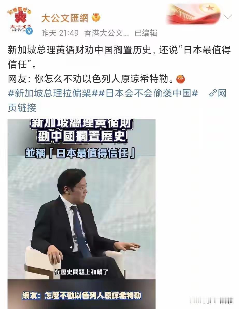 香港大公文汇网的报道,总是能直击要害。 关于新加坡总理黄勋财劝说中国要大度对待日本,并认为日本是最值得信赖的言论,大公网一句话就怼了回去,怎么不去劝以色列人原谅希特勒呢? 就这一句话,可以说是直击要害,一下子就捅到了嗓子眼上,这种简单明了,不绕弯子,直接反击的风格,不但所有国人爱看,而且也能把心存不良的人所带的虚伪面具,一下子扯下来,看着就是过瘾,如果是黄勋财在节目中发布了这一观点,立即有名记者用这句话回怼的话,那才叫更爽。