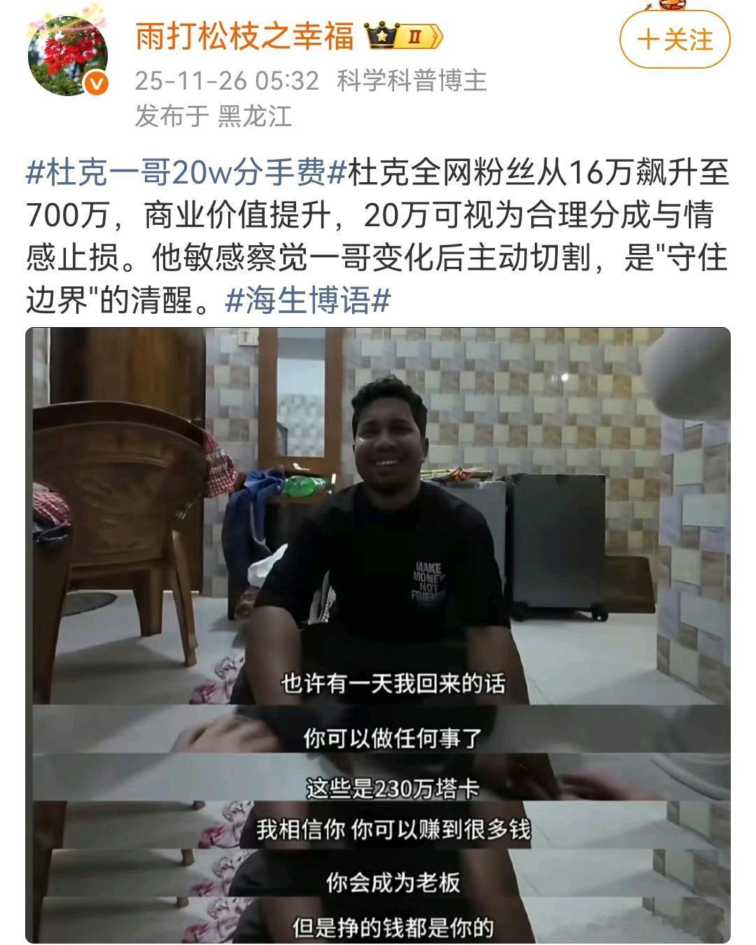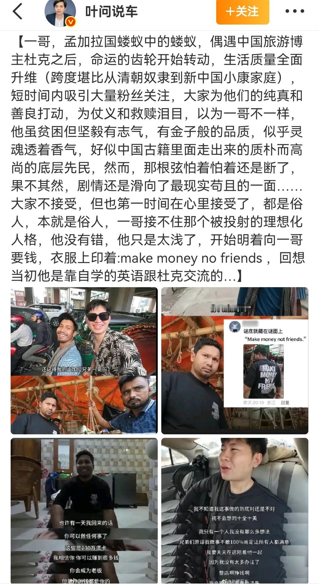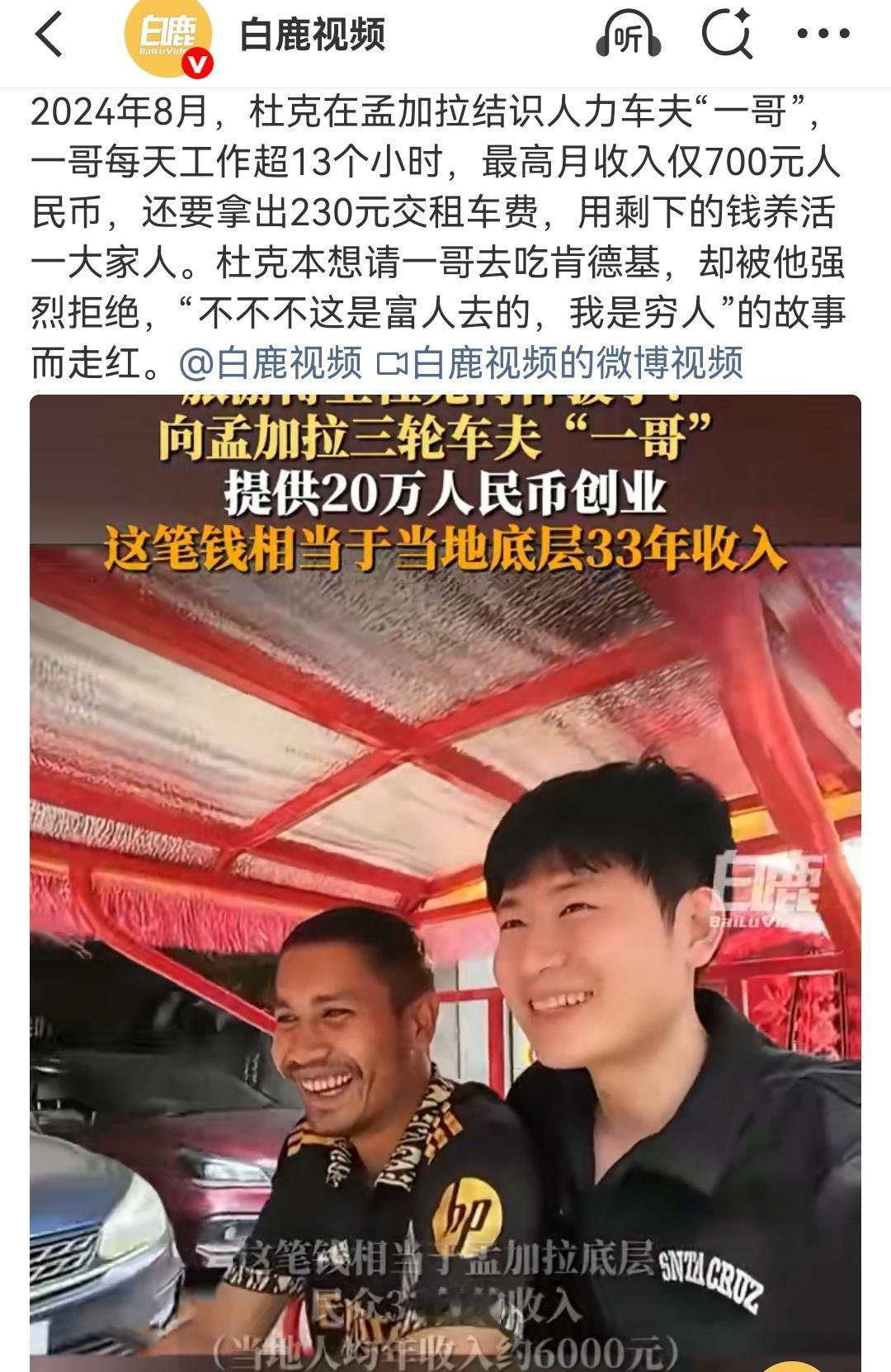 相识于微末,分别于高光。 (如图所示)去年一个环球旅游小博主“杜克”在孟加拉旅游,偶然结识了一个当地的三轮车夫“一哥”,他们之间充满友情的异国故事曾经让无数网友泪颜,但人性终归经不住考验。杜克已经成为大网红、大博主,一哥的生活也已天翻地覆。相识于微末,分别于高光,这才是人性,这才是生活。
