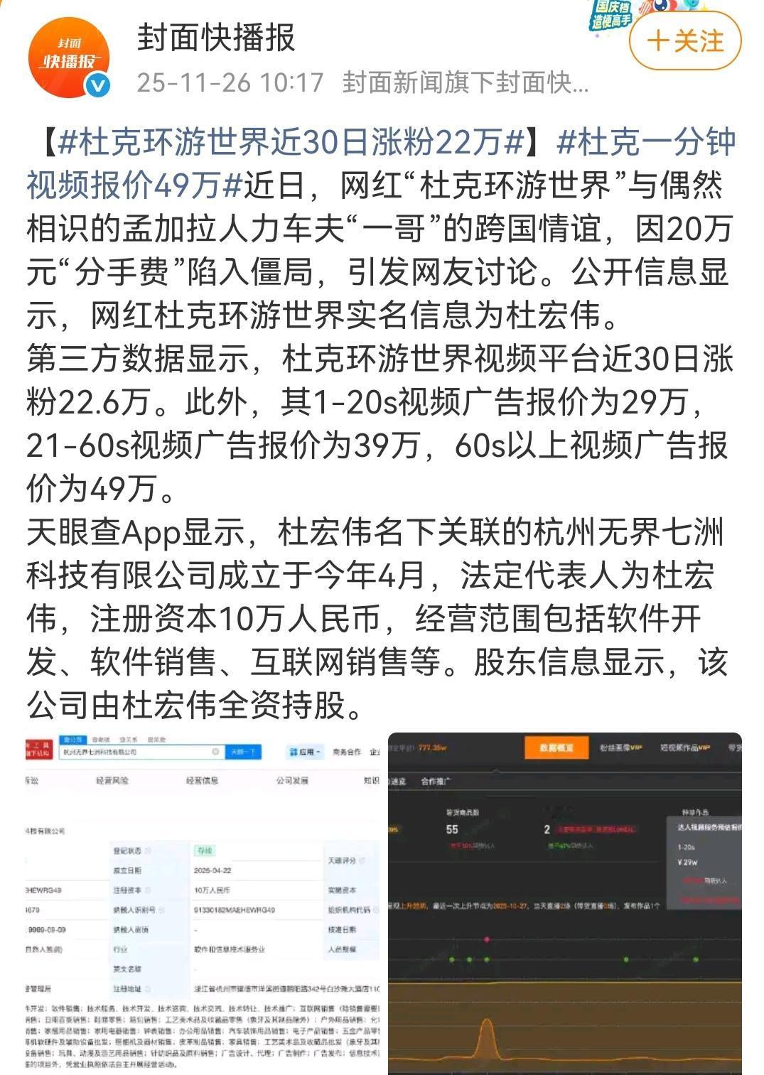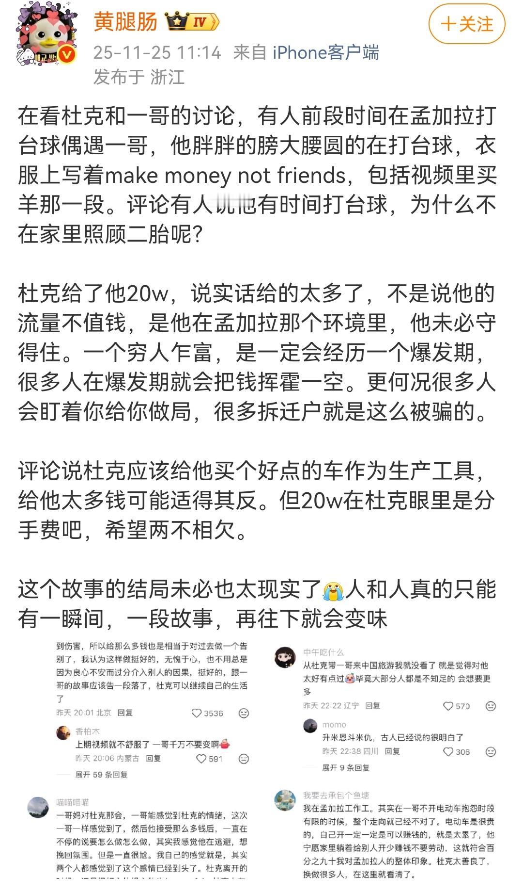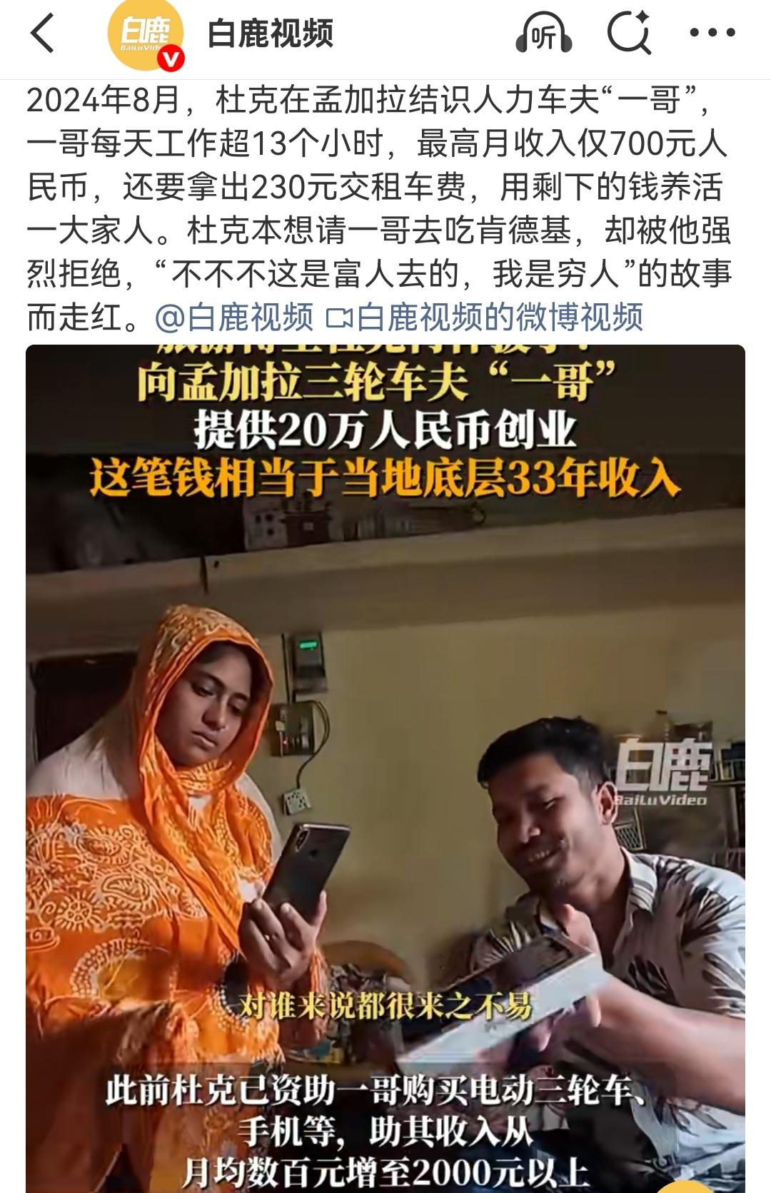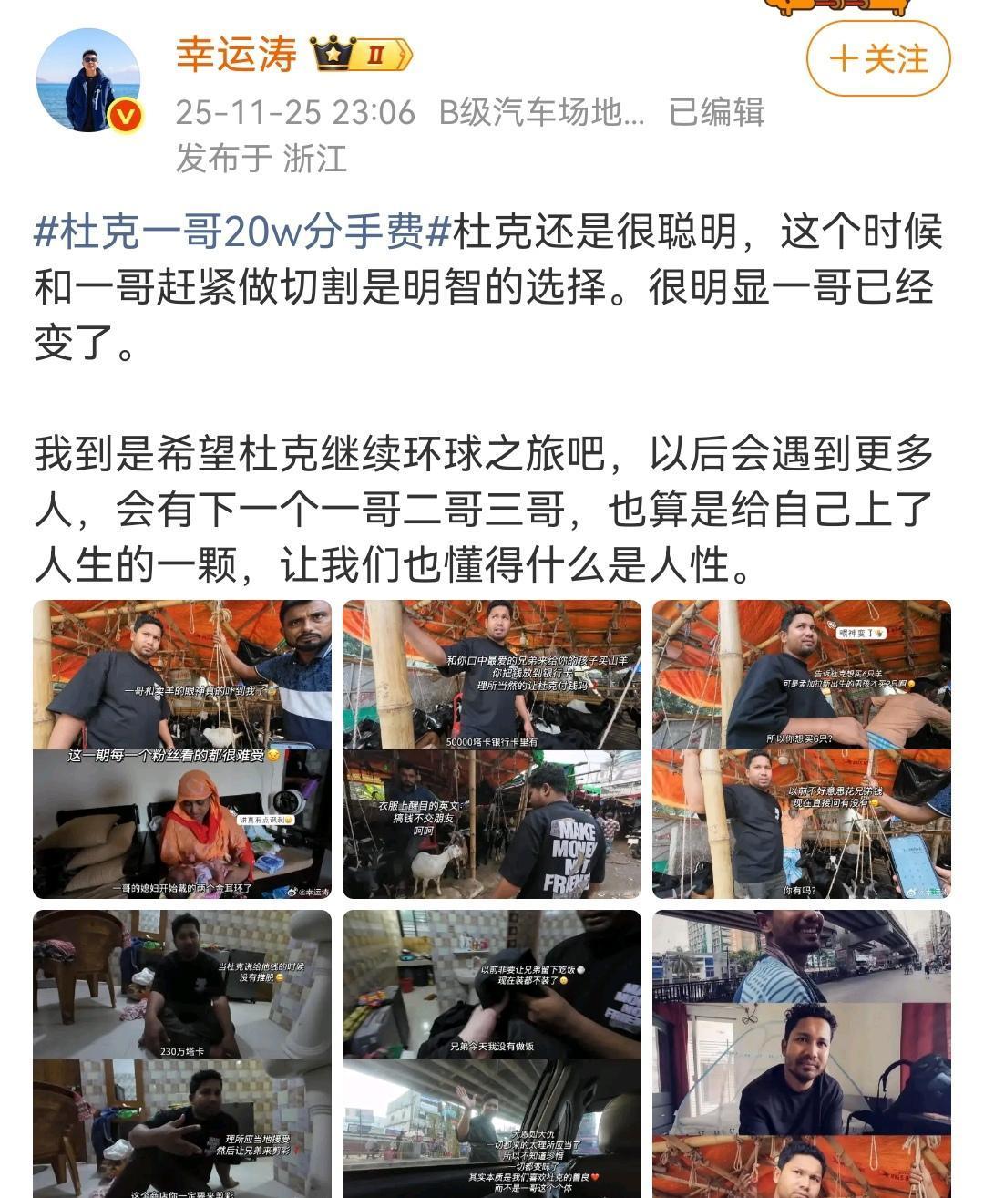 相识于微末,分别于高光。 (如图所示)去年一个环球旅游小博主“杜克”在孟加拉旅游,偶然结识了一个当地的三轮车夫“一哥”,他们之间充满友情的异国故事曾经让无数网友泪颜,但人性终归经不住考验。杜克已经成为大网红、大博主,一哥的生活也已天翻地覆。相识于微末,分别于高光,这才是人性,这才是生活。