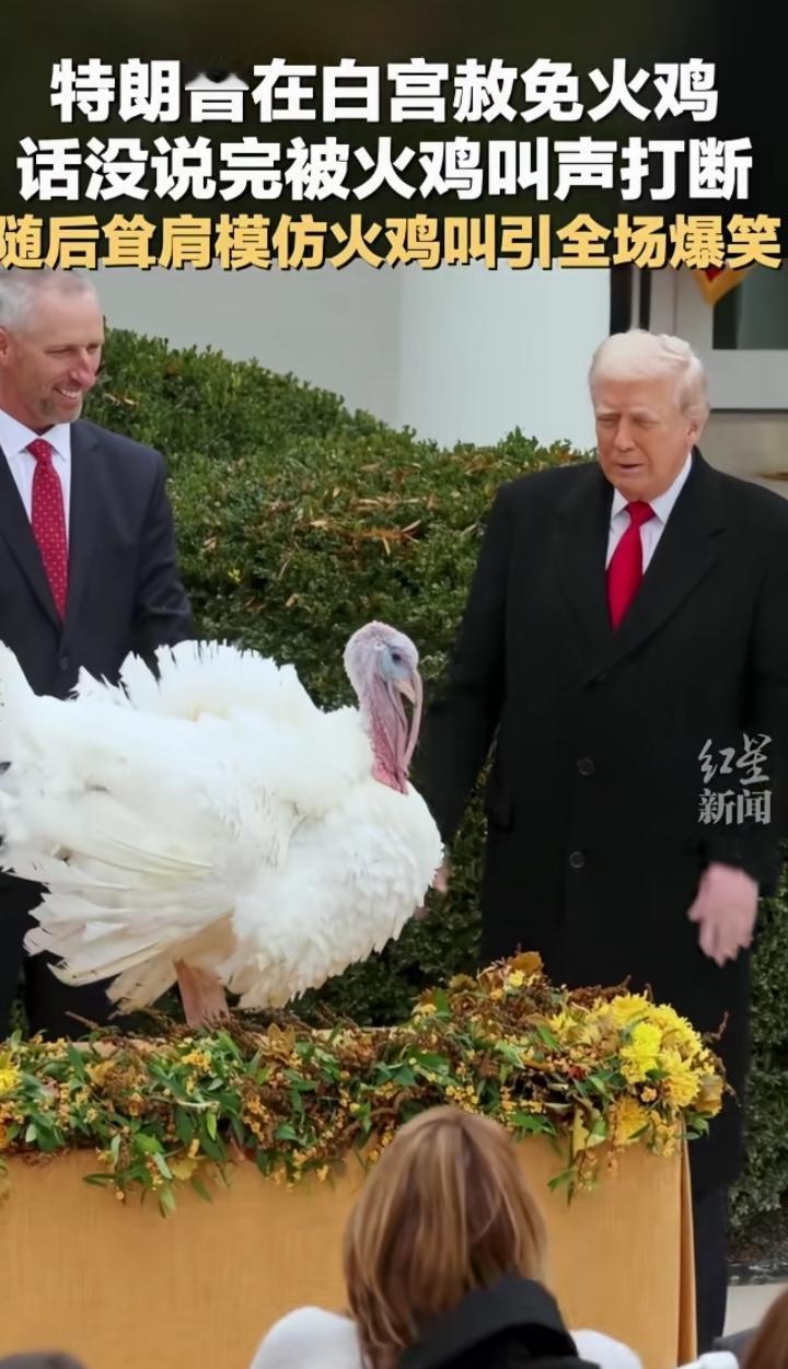 老特你是来搞笑的吗?他在白宫参加传统火鸡赦免仪式时,本来挺庄重一事儿,结果直接变成搞笑现场。 他对着火鸡说:“我在,火鸡你被赦免了”,他话都还没有说完呢,火鸡突然咕咕叫起来打断他,特朗普耸耸肩模仿火鸡叫,全场瞬间爆笑。这哪是严肃的仪式,分明是喜剧表演啊!