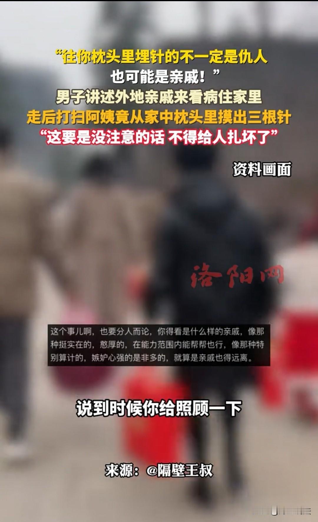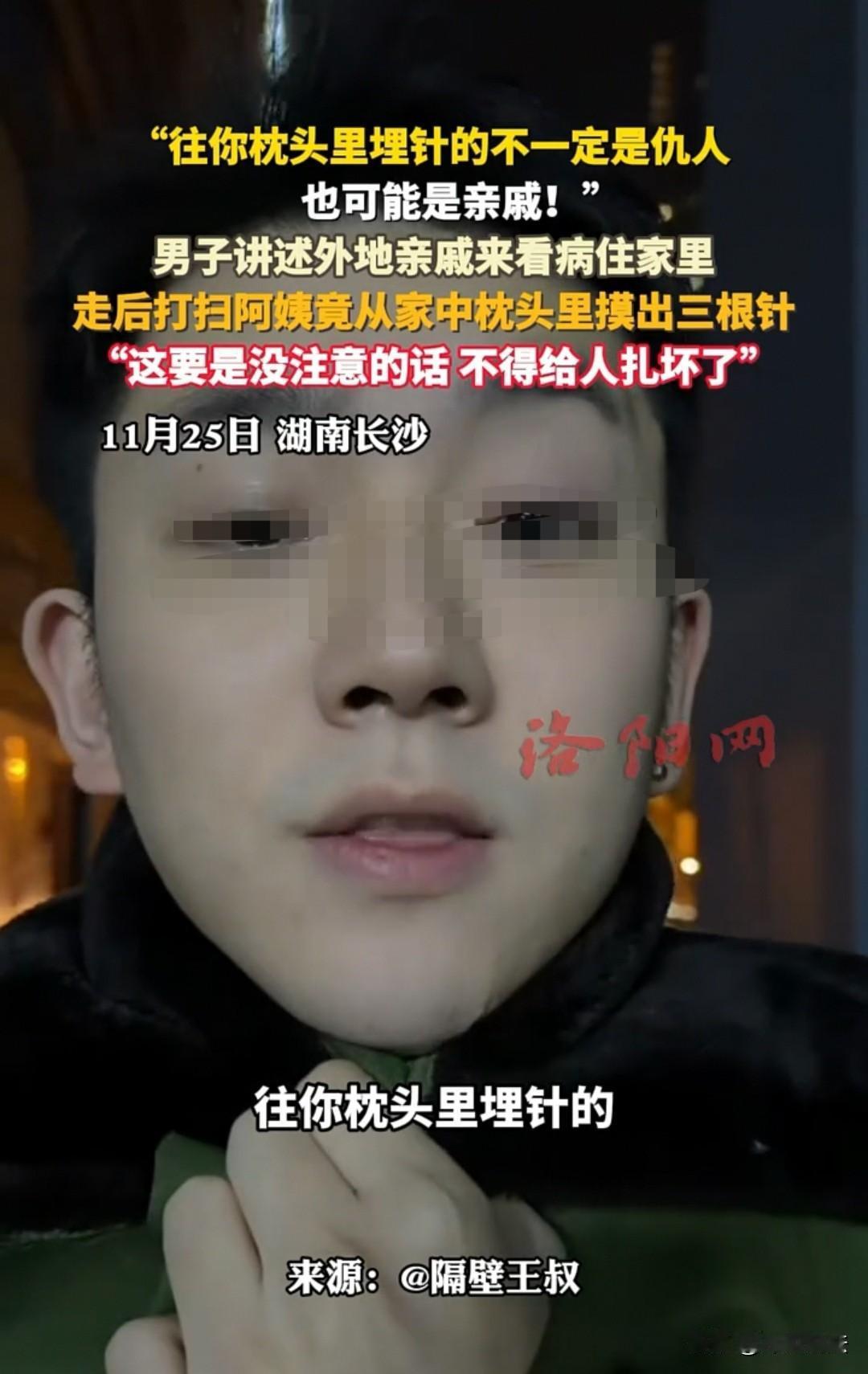 长沙,男子带亲戚吃大餐,对方嫌弃他点的菜辣,还因他没给他们垫付医药费而不满。最后,男子家的阿姨收拾卫生时,发现男子的枕头里有三根针。男子吓得一身冷汗,怀疑就是亲戚干的,于是立刻发布视频,说:害你的不一定是仇人,有可能就是你的亲人,有时候真的是好心没好报,真心不值得。 男子的父亲给他打电话,说有亲戚生病了,想到长沙来看一看。让男子帮忙接待一下。 男子觉得没问题,自己在这边开了公司,有地方住,因此就答应了。 当他们的飞机刚刚抵达长沙,男子就派公司的人去接他们俩,随后就带着他们到餐馆吃饭。 本来大家都是高高兴兴的,男子也想尽地主之谊,点了一些特色菜。谁知道他们刚刚吃了一口就开始吐槽起来,说他们本来就吃不得辣,这每道菜都是辣的。 男子有点不高兴,问他们吃什么的时候他们不说话,问他们有没有忌口的东西,他们也不回答。自己好心好意点的都是贵的、好的,结果他们反倒挑三拣四起来。 男子心想这也没啥,可能他们本来生病了,确实胃口不太好,也就没有当一回事,带着他们回了家居住。 第二天一早,男子又带着他们去看病。可因为是异地就医,要看完病才能报销,他们就不想先出这个钱,让男子先帮忙垫付。 男子觉得,他们和自己虽然沾亲带故,但并不是自己的至亲,凭什么让自己给他们垫钱呢? 再加上他们看到自己家里各方面条件都还可以,看自己混得也还行,说不定到时候根本就不会把钱还回来。 自己也不是缺这点钱,但做人不能这样。自己是凭能力、凭本事挣的钱,不能随便对谁都发善心。 他们来长沙,自己找人去接、请他们吃饭、给他们提供住宿,还带着他们来看病,这已经做得很到位了。至于医药费,自己没有义务再帮忙垫付。 对方有点不高兴了,说我下周就把钱给你,你先垫付一下怎么了? 这个口气更让男子不高兴了,感觉这钱就该他垫付一样。他强烈拒绝说:不行,这个钱我垫付不了。 看完病后,男子带他们回家,还甩下一句话:我要晚一点回来,飞机票我也给你们买好了,你们就直接回去吧,我也不安排人送你们了,因为下午我有事。 就这样,双方道了别。男子也终于松了口气,相当于摆脱了这群人的纠缠。 可到了晚上,家里的阿姨给男子打电话说:我在给你收拾房间的时候,发现你枕头里面有针,把我的手给扎破了。 阿姨还说,为了安全起见,她又把枕套拿下来查看,里面居然还有两根针。她赶紧告诉男子:这是什么人呀?见不得你好吗?怎么能做出这么恶毒的事情?万一你不知道,重重地躺下去,后果不堪设想呀! 男子一听,也惊出一身冷汗。这怎么帮人还帮出仇来了?反过来被人害,这得有多么恶毒呀? 他不再隐忍,直接发布视频告诉大家:害你的不一定是仇人,有可能就是你的亲人。你帮了他们,但凡有一丁点做得不到位,他们就会恨你、害你。 网友们看到后,也觉得太不可置信了。就算再不高兴,也不能用这种手段报答曾经帮助过自己的人,这怎么也说不过去。 一、阿姨在男子枕头里发现三根针,但无直接实证证明是亲戚所为,若男子直接在视频中明确指认该亲戚,或发布含指向性极强的言论,可能涉嫌侵犯对方名誉权。 《民法典》第一千零二十四条 民事主体享有名誉权。任何组织或者个人不得以侮辱、诽谤等方式侵害他人的名誉权。名誉是对民事主体的品德、声望、才能、信用等的社会评价。 本事件中,发布视频若未明确证据却指向特定人,可能被认定为“诽谤”,导致对方社会评价降低;虽无直接证据不必然构成侵权,但需承担举证责任,举证不足则需承担侵权责任。 二、若查证确实是亲戚所为,其行为并非“涉嫌伤害辨认身体”,而是涉嫌故意伤害(未遂)或寻衅滋事,建议男子直接报警,追究其行政或刑事责任。 《治安管理处罚法》第四十二条 有下列行为之一的,处五日以下拘留或者五百元以下罚款;情节较重的,处五日以上十日以下拘留,可以并处五百元以下罚款:(一)写恐吓信或者以其他方法威胁他人人身安全的。 本事件中,往枕头放针属“以其他方法威胁他人人身安全”,即便未造成实际伤害,也违反治安管理规定;若情节恶劣(如针带毒性、多次实施),还可能涉嫌故意伤害罪(未遂),面临刑事处罚。 对于此事,大家如何看? 素材来源于洛阳网,2025年11月26日