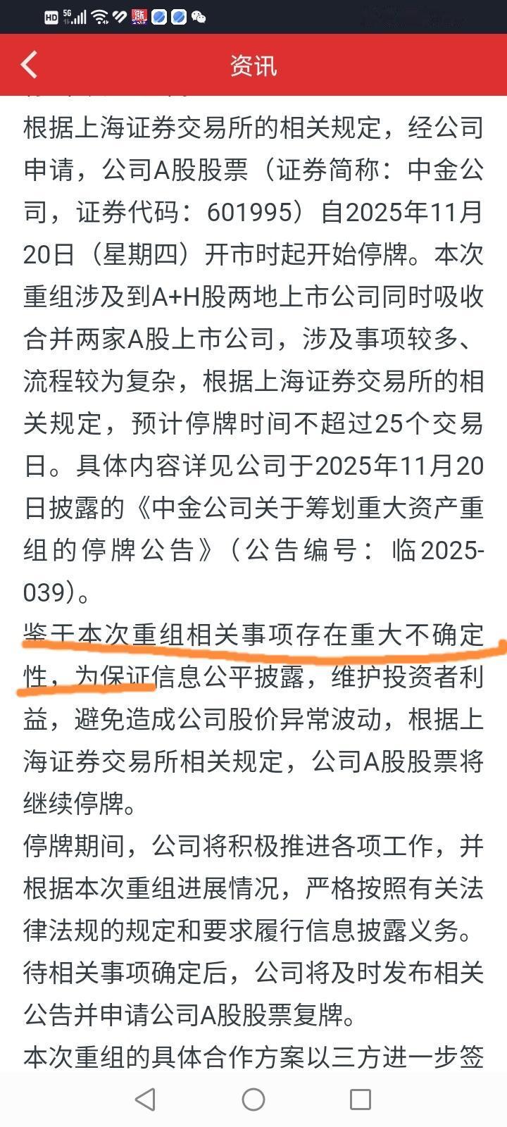 难道空欢喜一场?今晚中金公司发布继续停牌公告;鉴于本次重组相关事项存在重大不确定性,公司股票继续停牌。 作为持有中金公司的小散,咱的心又有点吊篮打水——七上八下了。不过因为被关小黑屋了,咱着急也没用,一切顺其自然吧! 但仅从技术层面分析,这次中金公司并购重组的难度应该不会比国泰君安与海通证券的高。因为被并购的东兴证券和信达证券都没有H股,只有中金公司有H股。而国泰海通的并购可是并购双方都有H股。 但愿中金公司的这次三方并购重组能顺利完成。