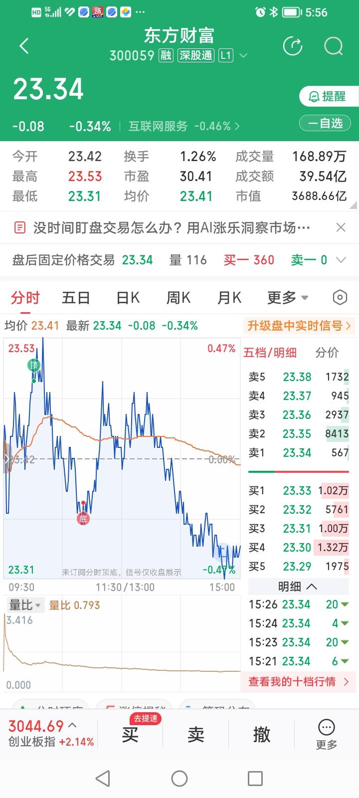 东方财富到底怎么了? 作为创业板第二大权重股,今天创业板指数收盘大涨2.14%,东方财富股价不跟随大涨也就罢了,收盘竟然逆势下跌了0.34%。 作为曾经和中信证券争夺市值一哥的人气股,今天中信证券收盘上涨0.47%,东方财富竟然是下跌了。 同花顺和东方财富同为互联网金融信息服务行业的头部企业,同花顺股价今天收盘上涨0.58%,东方财富也不跟随同花顺上涨。 东方财富这种逆大盘、逆行业、逆天的自顾自的绵绵下跌简直无敌了。