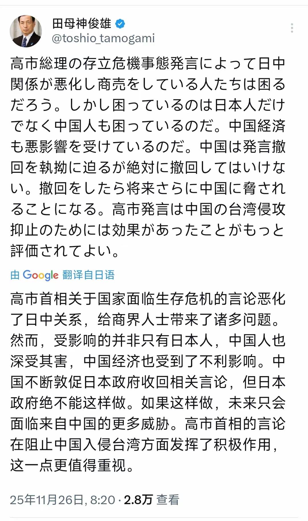 日本“昭和遗老”又出来上演迷惑行为大赏了!田母神俊雄居然把高市早苗那番恶化了中日关系的极端言论,吹捧成“保护台湾”的功绩?这颠倒黑白的功力,堪称“指鹿为马”现代版!说什么怕“中国的威胁”所以不能改口,说白了就是不敢承认自己玩砸了,只能硬着头皮在错误道路上走到黑。可惜啊,时代变了,今日中国不吃这一套!最后一句大实话怼脸:企图靠撒谎维持的“面子”,最终都会变成砸穿地板的“里子”!