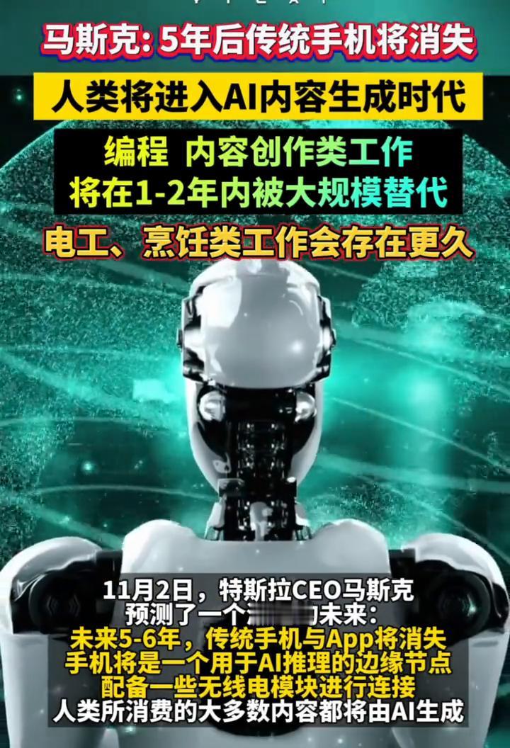 马斯克:5年后传统手机将消失,人类将进入AI内容生成时代。 编程内容创作类工作将在1-2年内被大规模替代,电工、烹饪类工作会存在更久。 11月2日,特斯拉CEO马斯克预测了一个激进的未来:未来5-6年,传统手机与App将消失。手机将是一个用于AI推理的边缘节点,配备一些无线电模块进行连接,人类所消费的大多数内容都将由AI生成。 谈及AI取代人类职业,马斯克预测一些如邮件处理、电话客服的桌面工作正在快速消失,而编程、内容创作这类工作大概会在1-2年内被大规模替代。驾驶、物流工作会在自动驾驶成熟后快速转变。 AI仍然是数字的,移动原子比移动比特困难得多,因此物理劳动如焊接、管道、电工、烹饪会存在更久,但最终也会被机器人替代。