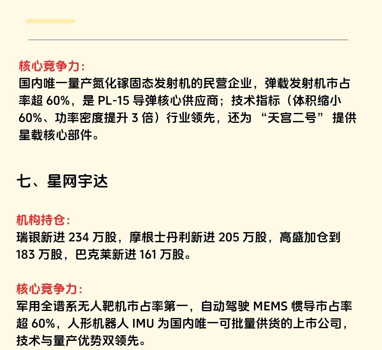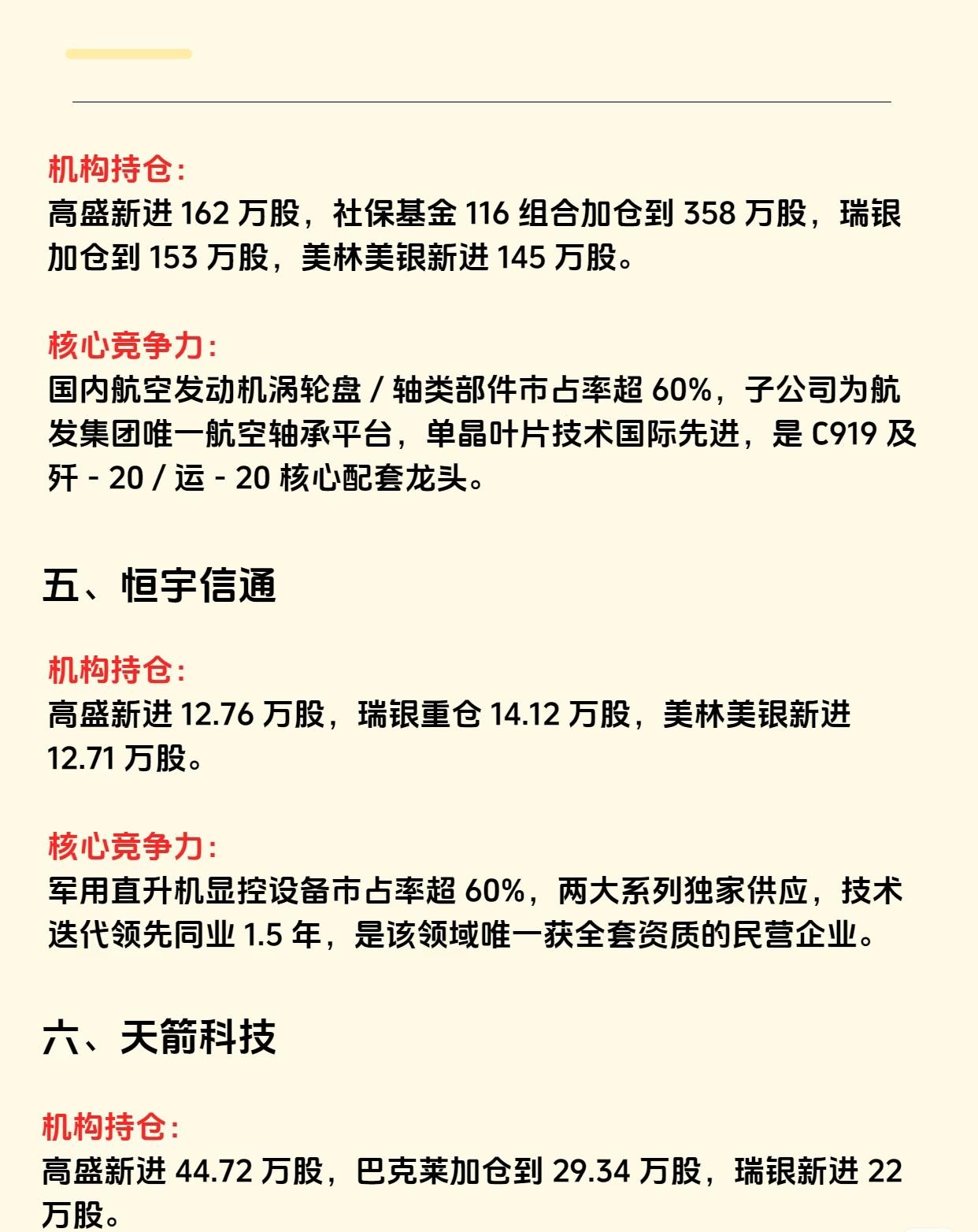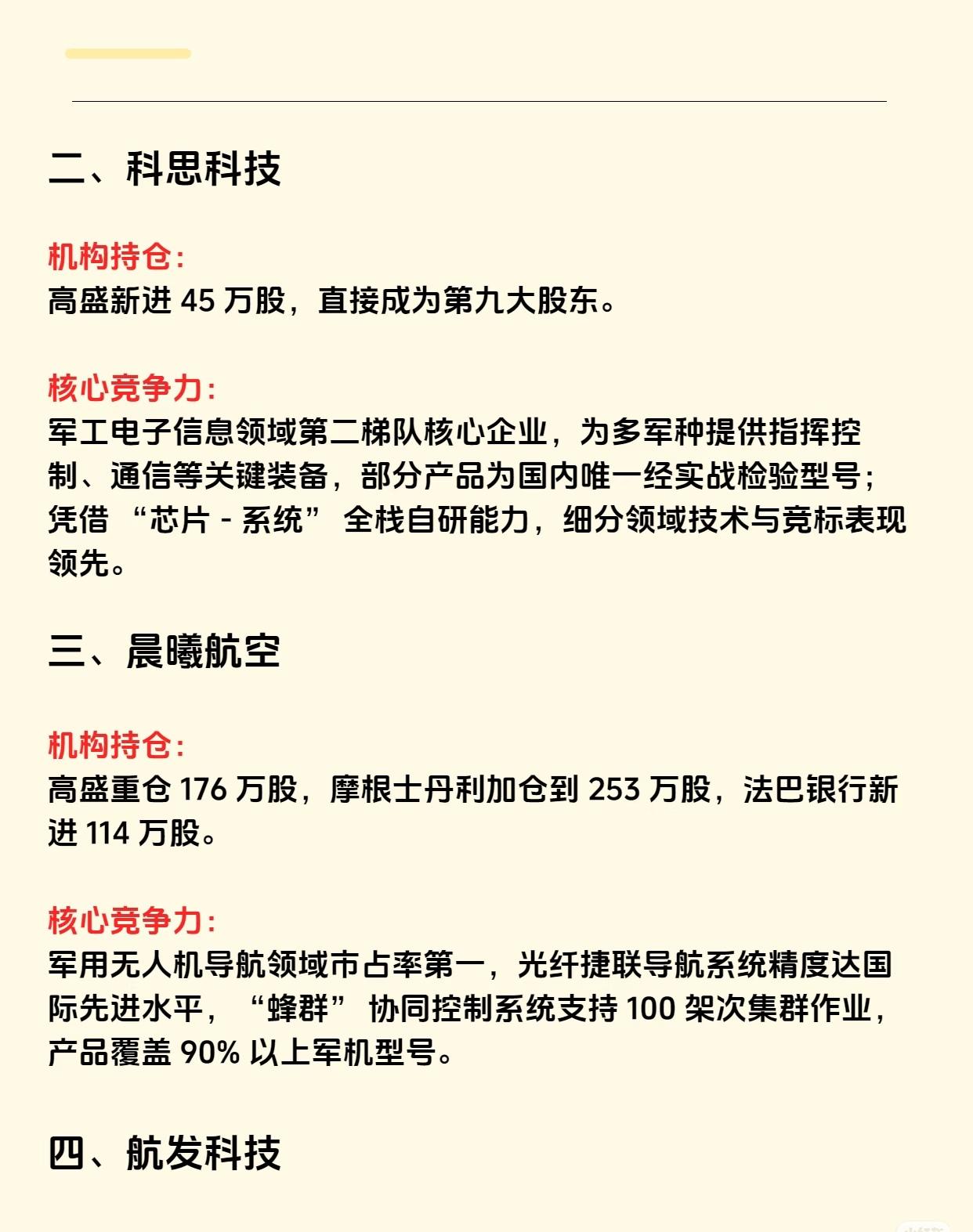 高盛等国际顶级机构重仓的7只军工隐形龙头及其核心信息如下: 一、北方长龙 机构持仓方面,摩根士丹利新进17万股,瑞银新进15.33万股,社保基金2108新进9.23万股,JP摩根新进8.89万股,高盛新进8.5万股。核心竞争力上,该公司军用车辆内饰市占率超70%,是该领域唯一参与国家军用标准起草的企业,产品覆盖67个陆/海/火箭军车型,轻量化技术指标领先行业。 二、科思科技 机构持仓中,高盛新进45万股,直接成为第九大股东。核心竞争力方面,其为军工电子信息领域第二梯队核心企业,为多军种提供指挥控制、通信等关键装备,部分产品是国内唯一经实战检验的型号;凭借“芯片-系统”全栈自研能力,在细分领域技术与竞标表现领先。 三、晨曦航空 机构持仓包括高盛重仓176万股,摩根士丹利加仓至253万股,法巴银行新进114万股。核心竞争力上,该公司在军用无人机导航领域市占率第一,光纤捷联导航系统精度达国际先进水平,“蜂群”协同控制系统支持100架次集群作业,产品覆盖90%以上军机型号。 四、航发科技 机构持仓显示,高盛新进162万股,社保基金116组合加仓至358万股,瑞银加仓至153万股,美林美银新进145万股。核心竞争力方面,其在国内航空发动机涡轮盘/轴类部件市占率超60%,子公司为航发集团唯一航空轴承平台,单晶叶片技术国际先进,是C919及歼-20/运-20的核心配套龙头。 五、恒宇信通 机构持仓中,高盛新进12.76万股,瑞银重仓14.12万股,美林美银新进12.71万股。核心竞争力上,该公司军用直升机显控设备市占率超60%,两大系列独家供应,技术迭代领先同业1.5年,是该领域唯一获全套资质的民营企业。 六、天箭科技 机构持仓包括高盛新进44.72万股,巴克莱加仓至29.34万股,瑞银新进22万股(注:原文未完整披露其核心竞争力的具体信息)。 七、星网宇达 机构持仓中,瑞银新进234万股,摩根士丹利新进205万股,高盛加仓至183万股,巴克莱新进161万股。核心竞争力方面,该公司军用全谱系无人靶机市占率第一,自动驾驶MEMS惯导市占率超60%,人形机器人IMU为国内唯一可批量供货的上市公司,技术与量产优势双领先。 综上,这7家企业均为军工细分领域的“隐形冠军”,在技术壁垒、市场地位及机构认可度上表现突出,高盛等国际顶级机构通过新进或加仓动作释放了明确的布局信号。
