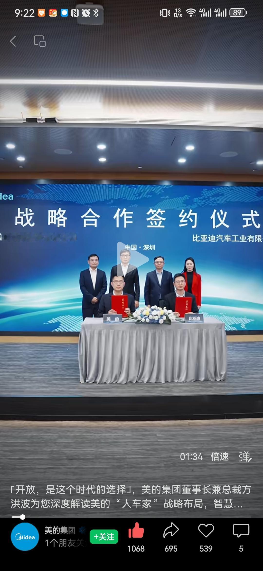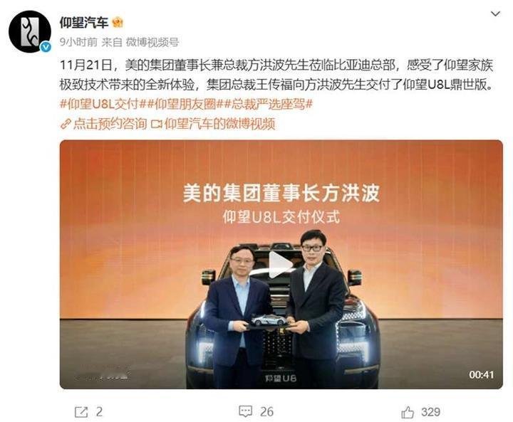 比亚迪让生活更美的,这句广告词真是太妙了,比亚迪与美的集团强强联合,真的是一张妙棋!人车家生态互联,眼看着就要实现了。美的是中国顶级的家电生产企业,手中还有库卡机器人,而比亚迪是中国新能源汽车引领者,而且还是电子代工巨头。想想以后,家里面的情况在车机大屏就一目了然,实在是太美妙了。不仅如此,美的掌门人方洪波还成为了仰望U8l的车主