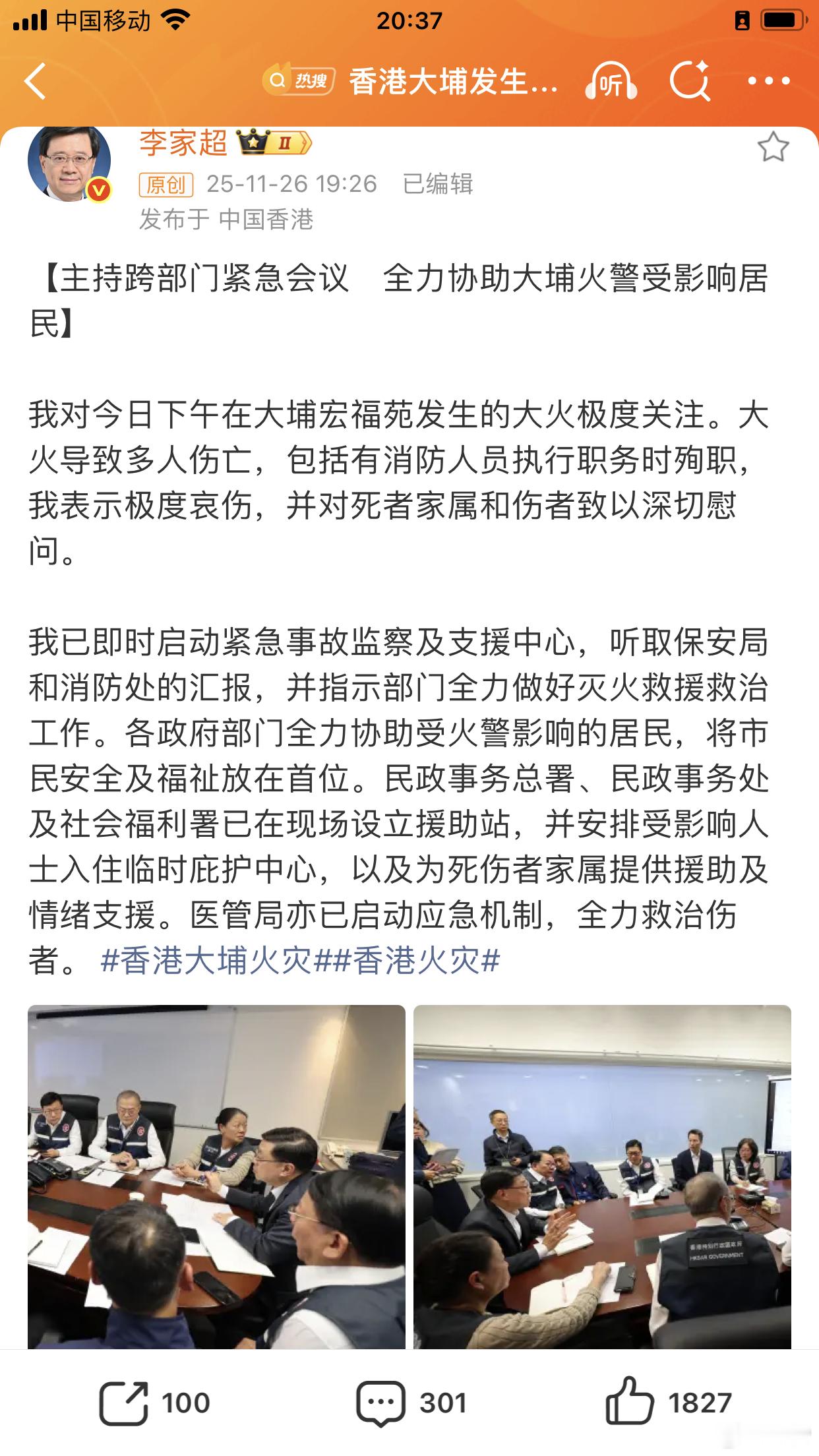 香港大埔火灾 13人死亡,28人受伤。木旺琪琪:宏福苑40楼龄 最难的是业主意见不一致,争了很久今年统一维修 外墙维修 业主正常住 应该修好一栋再修别一栋, 特首李家超:即时启动 紧急事故监察及支援助中心,图1、图2 //40 楼龄 旧楼维修 最难的是业主意见不一致 争了佷久 今年统一维修, 应该修好一栋 再修另外一栋。 施工队为了延长工期, 统一3月拆棚, 这样给业主带来不方便 出事也连片又危险 蹲一个调查责任 牺牲消防员才 30岁 香港火灾 //金东)新京报视频:【香港大火已致12死火警升为5级】香港楼群大火已致多死有消防员殉职11月26日下午,香港大埔宏福苑发生火灾,已造成12人死亡,火警于下午6时22分升为五级。香港消防部门自1964年起实施火警分级制度,包括灾难级在内共分六级。当火势完全失去控制且迅速蔓延、受伤人数增加时,火警升至五级,通常最少有35辆消防车、150名消防员及26至50条消防水带,并改由消防总长指挥。若火势继续加剧,民政事务总署会统筹,多个部门协助救援。据悉,宏福苑共有8幢大厦,屋苑正进行大维修,所有大厦均搭有棚架及盖上棚网。香港楼群大火救援直播(记者:苗玉薪 制作:王子轩)