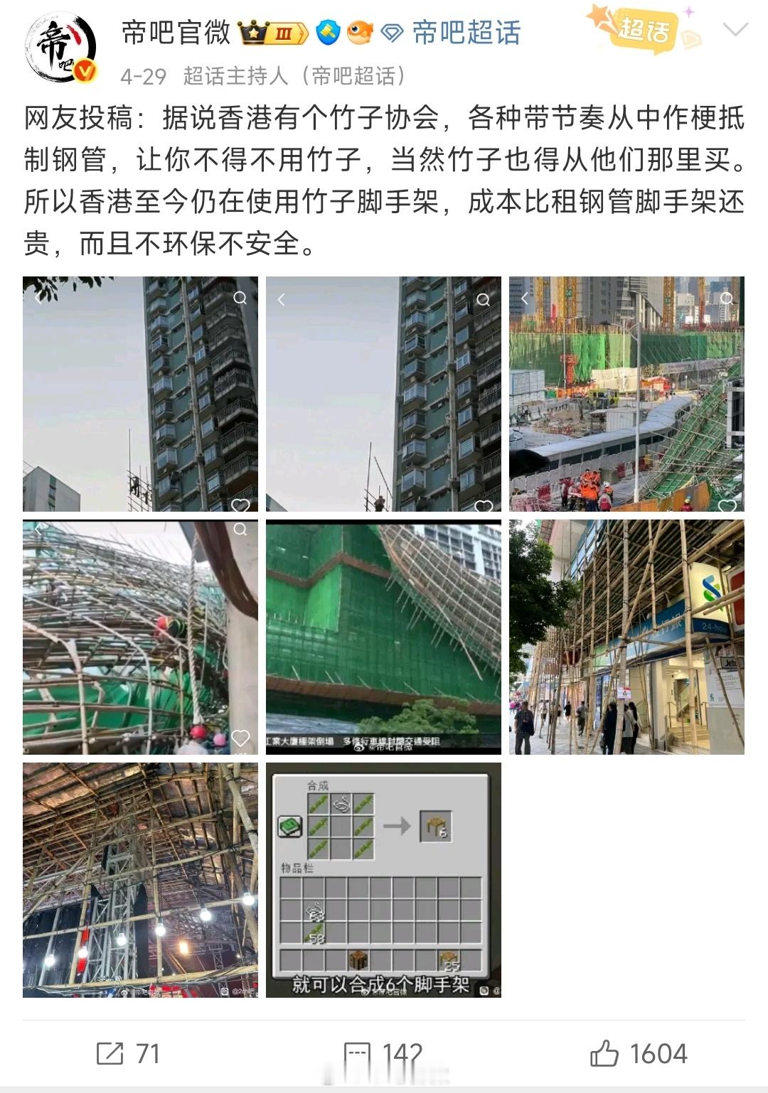 香港火灾 香港这个奇葩竹子脚手架以前就说过,不环保不安全,现在外墙失火这么严重,脚手架绝对是在助燃的。希望吃一堑长一智吧,不要为了利益做这种蠢事了 竹脚手架