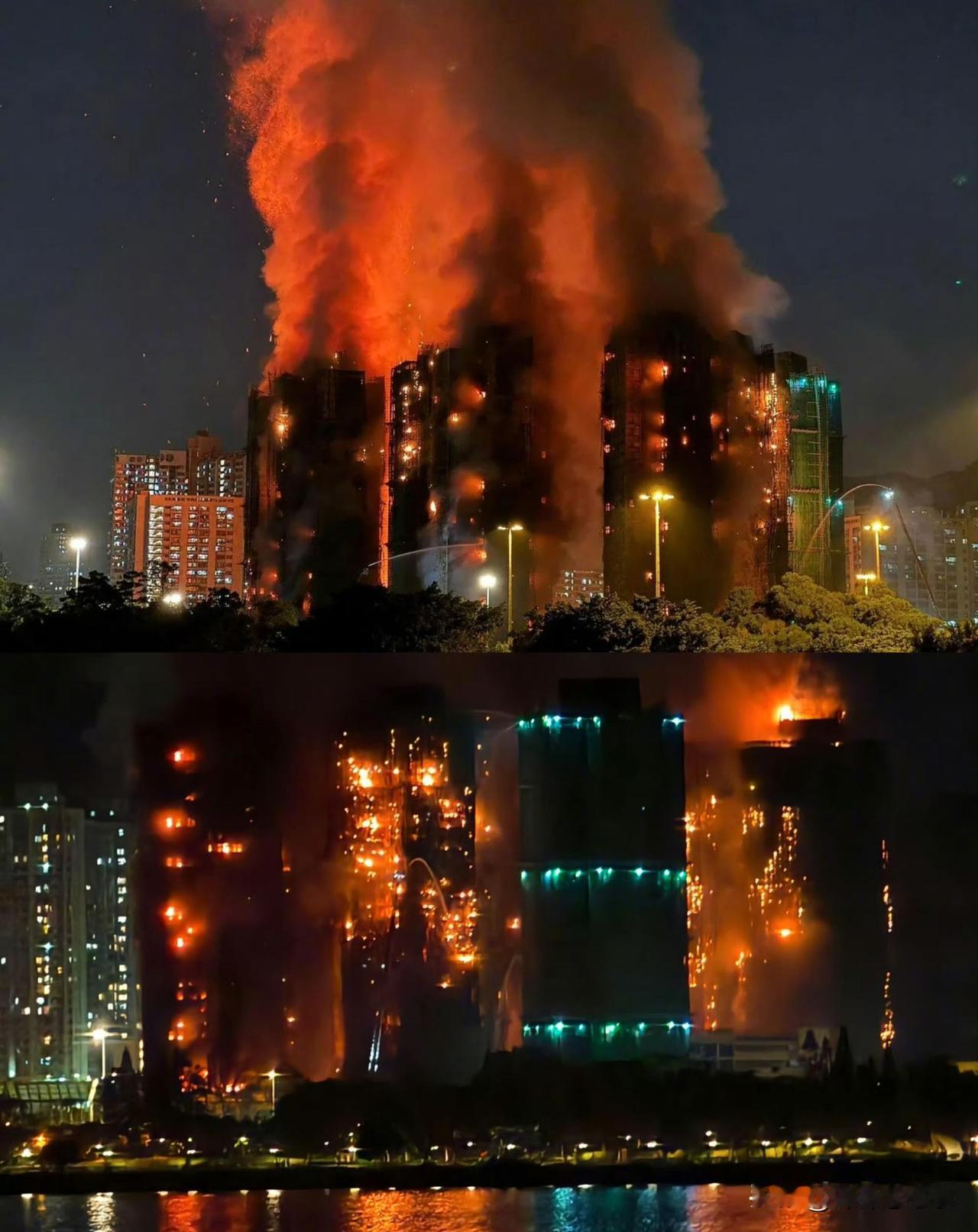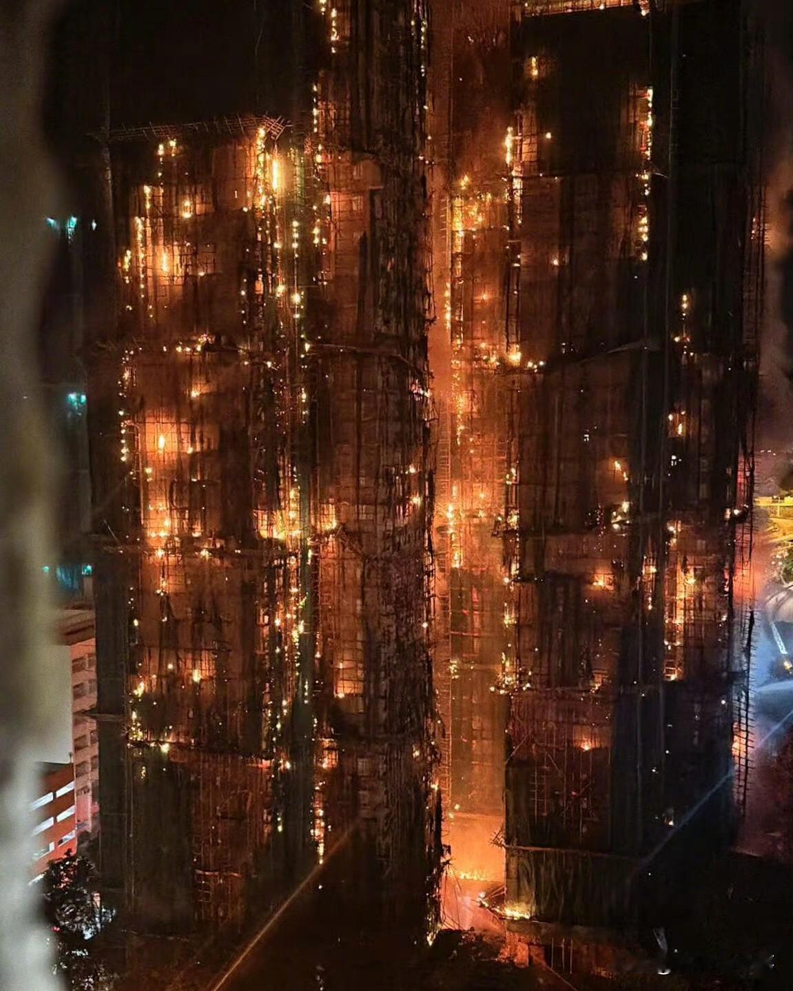 我的天啊 从下午两点多开始烧 烧到现在都还没扑灭吗? 看图片上这片区域房子好密集 好吓人啊! 而且八栋楼一起烧不觉得很诡异吗 起火大楼