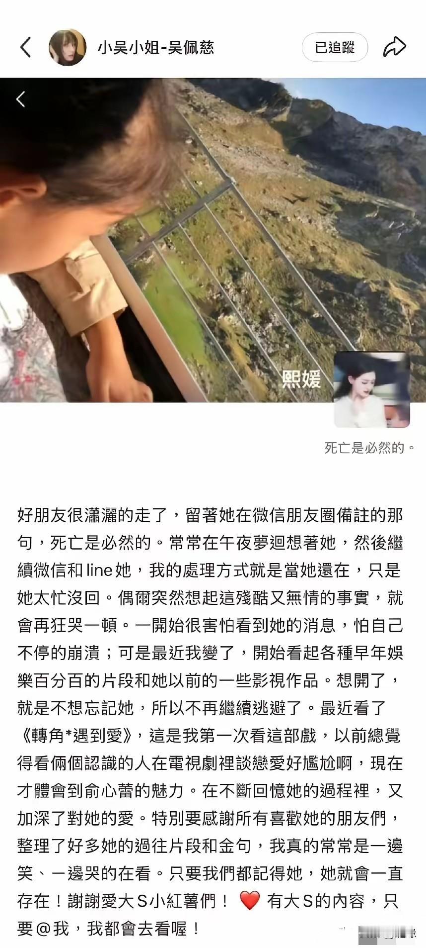 大S的微信截图,又看哭无数人! 朋友圈备注“si亡是必然的”,头像是她与儿子,背景图是女儿,一边是她面对si亡的坦然,一边是她藏不住的母爱! 有没有发现,大S的微信头像和背景,不是她和具俊晔的合照,而是她和两个孩子的照片。由此可见,大S此生最爱的人是两个孩子,最牵挂的人也是孩子,而不是具俊晔。 不知道,S一家看到大S的微信时,会不会想念她的两个孩子,毕竟孩子才是她这辈子最大的牵挂。 按理来说,孩子才是最需要被照顾和爱的人,可S一家宁愿照顾具俊晔,也不愿意看孩子一眼。难道,不是应该爱屋及乌,爱她所爱吗? 假如大S看到,该有多心痛?