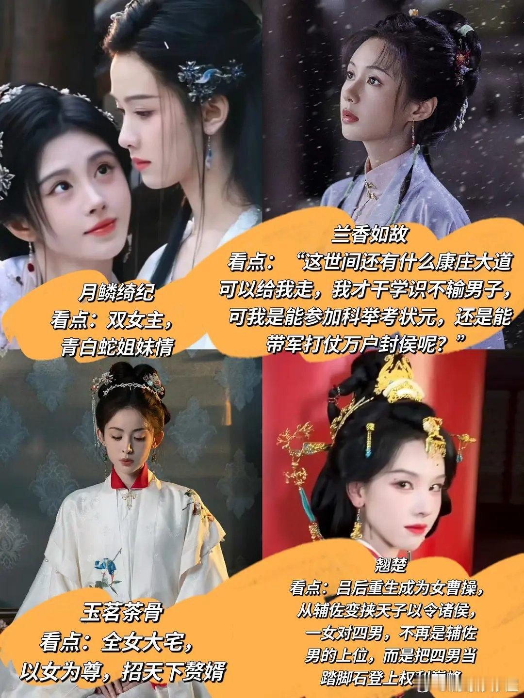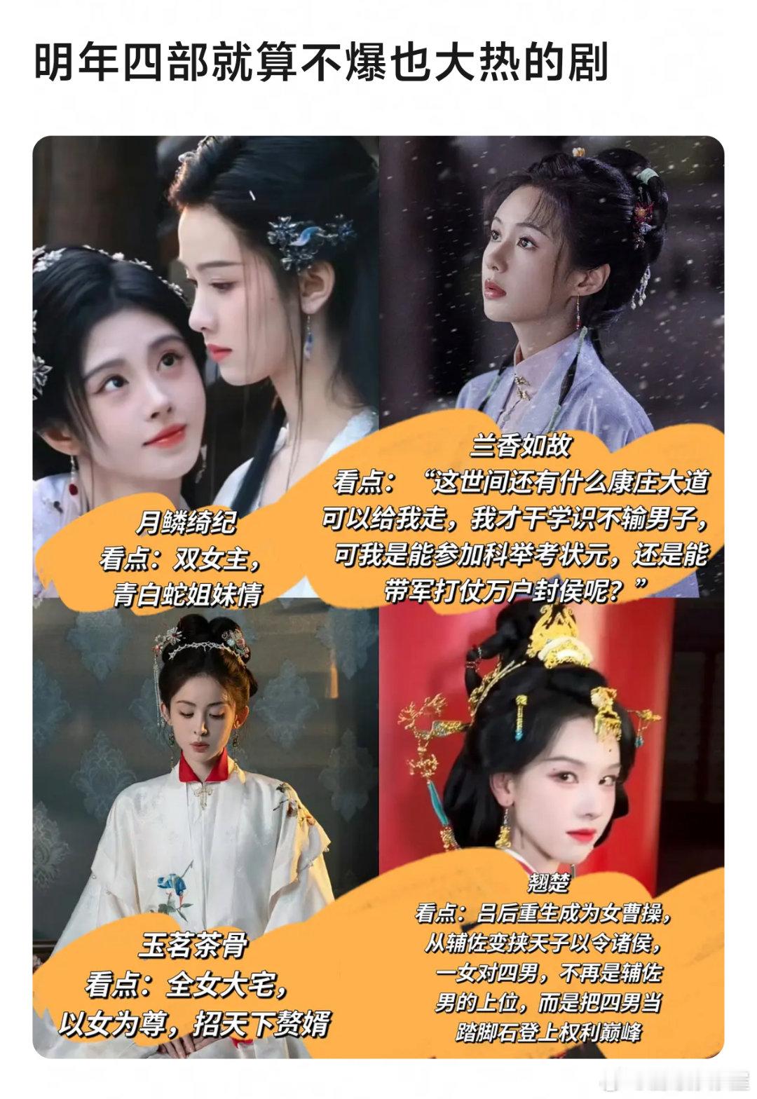 网友预言明年四部不大爆也会热播的剧——《月麟绮纪》、《兰香如故》、《玉茗茶骨》、《翘楚》都是女本位的剧哎