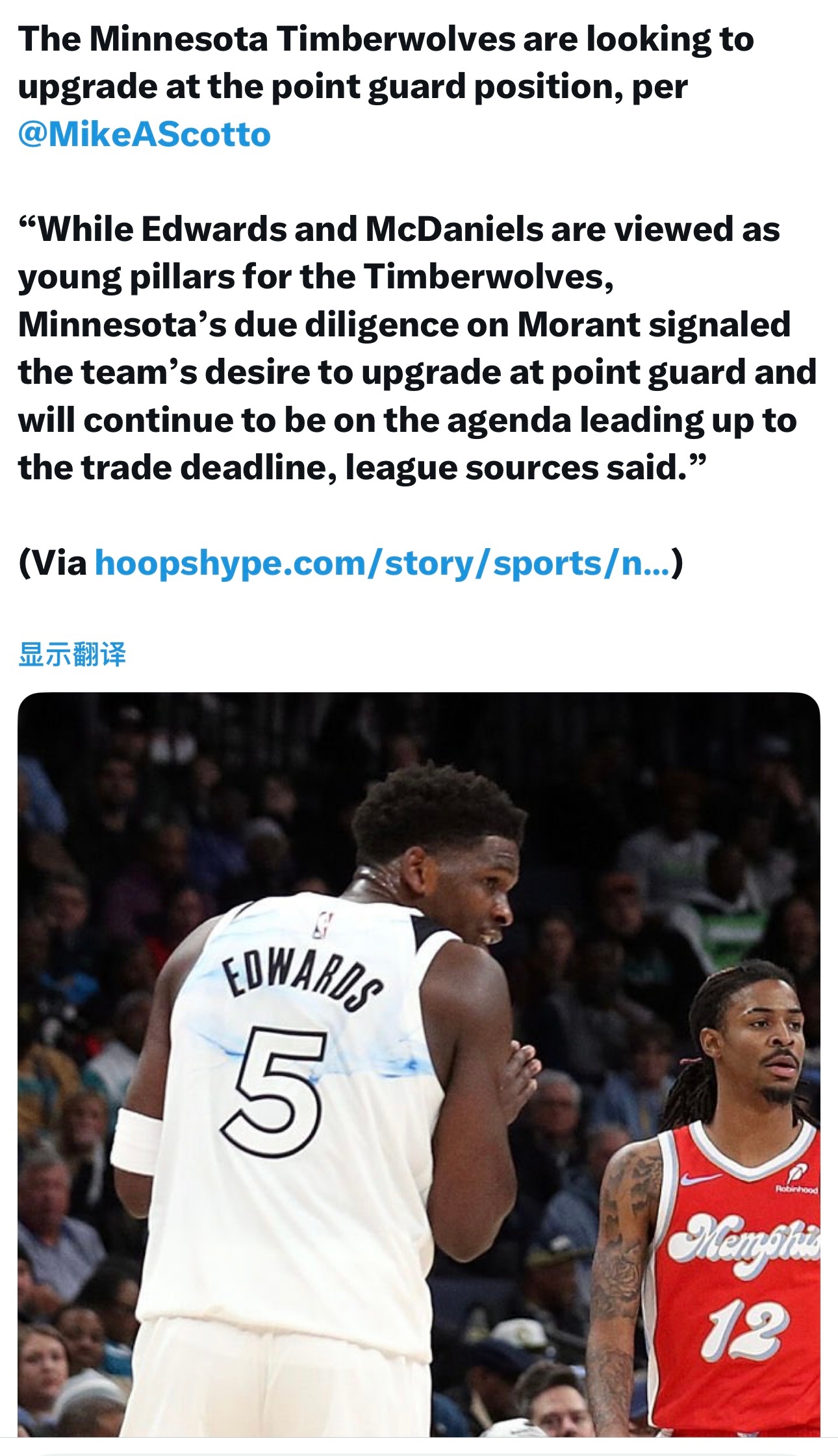 记者Michael Scotto:森林狼寻求升级控卫位置!“联盟消息人士透露,虽然爱德华兹和麦克丹尼尔斯被视为森林狼的年轻核心,但森林狼对莫兰特开展的尽职调查,表明他们有意升级控卫位置。在交易截止日前,这一需求会持续被提上议程。”