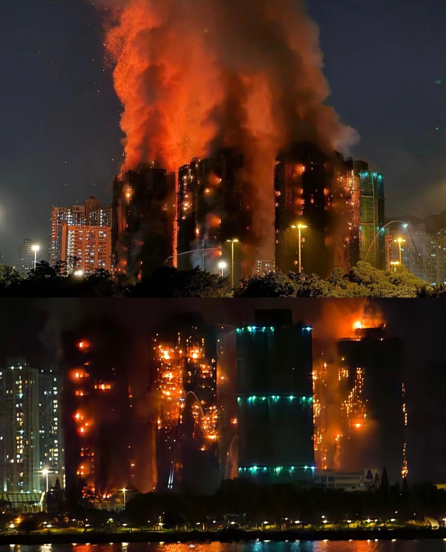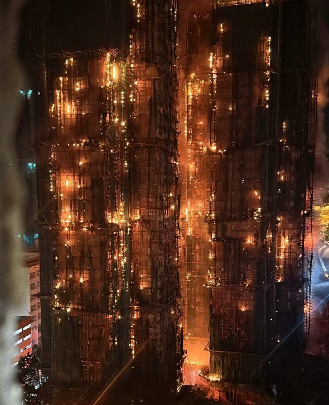 8栋楼,1900多户,从白天烧到晚上,40年楼龄翻新,图4外墙全都是搭建的竹制脚手架。愿平安(话说这么易燃的材质是可以的吗..)