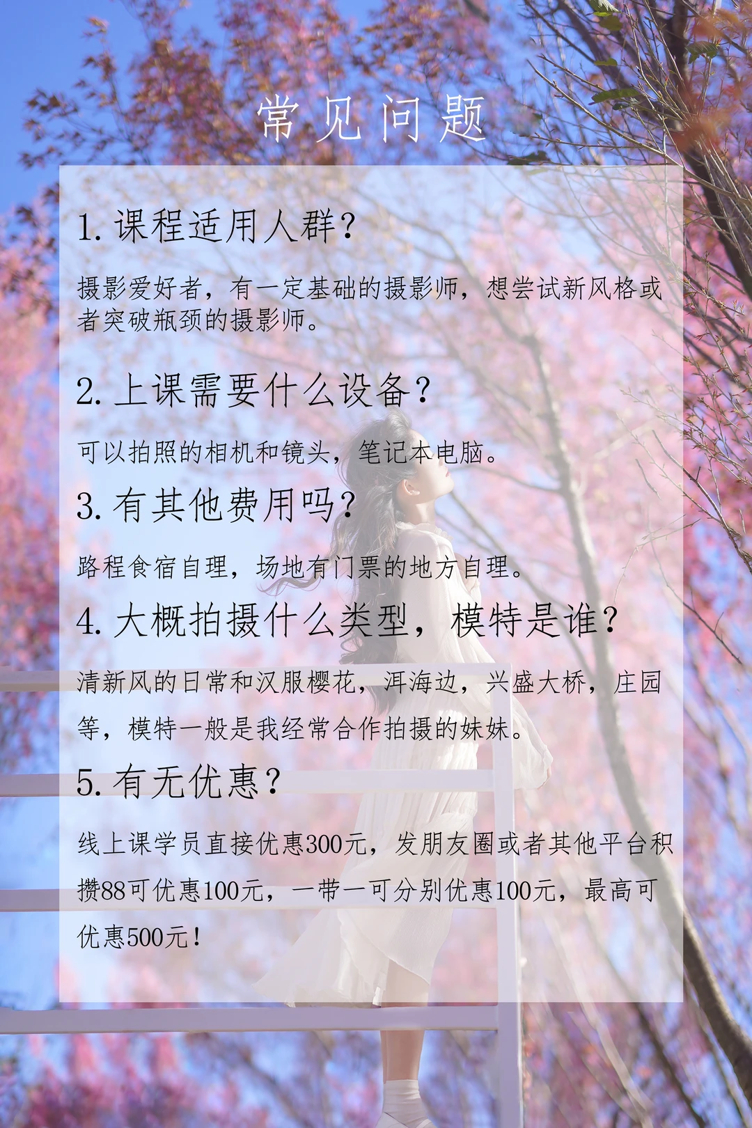 中旬樱花开的时候会去那边拍樱花和苍山洱海,冬季的海鸥,兴盛大桥这些,面授课程五天时间,第一天前期基础知识讲解,第二三四天带拍六组创作,四套日常,两套汉服,第五天讲解后期修图和平台账号搭建,运营知识等,超多干货分享,快来找我学习吧ヾ(≧▽≦*)o!!!