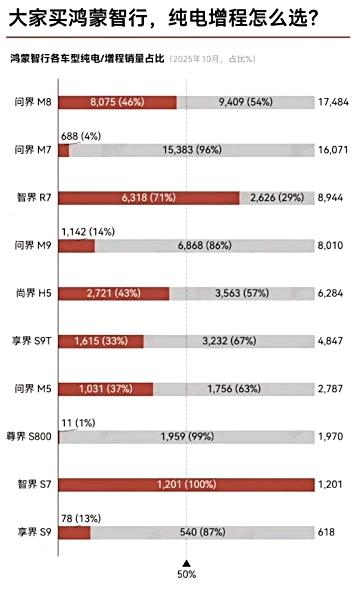 买鸿蒙智行的车,纯电/增程怎么选? 看到一张很有意思的图片, 说的是鸿蒙智行各个车型纯电/增程销量占比, (红-纯电,灰-增程), 其中问界M8基本是50%:50%的比例。 也想问问大家,如今再买车, 会更偏向纯电还是插混(增程)? 【来自懂车帝车友圈】