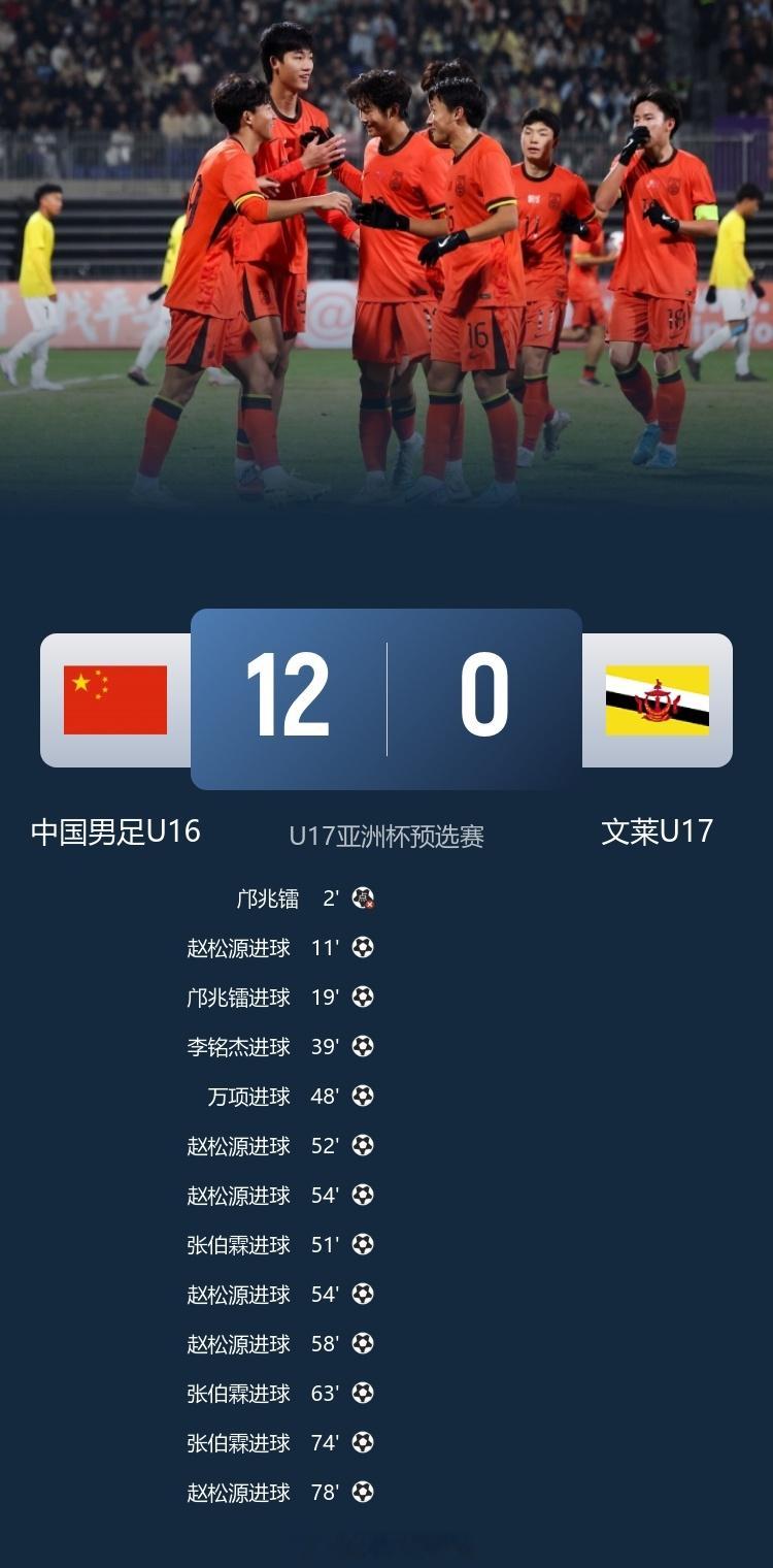 3场狂轰30球!U16国足12-0文莱U16 赵松源独中六元张伯霖替补戴帽足球u17国足vs文莱u17 11月26日讯 北京时间19:35,U17亚洲杯预选赛中国男足U16vs文莱U16,比赛在重庆铜梁龙体育场打响!上半场,赵松源开场1分钟造点,邝兆镭主罚被扑出;万项角球助攻赵松源头球破门!随后邝兆镭破门扩大领先优势;万项角球再次助攻,李铭杰破门!补时阶段,万项再下一城!赵松源连进2球完成帽子戏法!下半场,赵松源再进3球,张伯霖替补登场戴帽。
