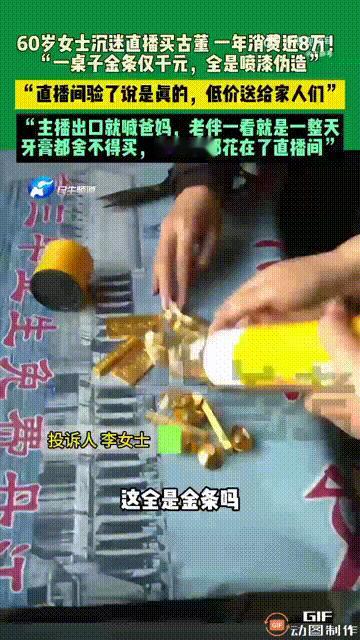 家里有老人的必须注意!河南南阳一位60岁老人很喜欢看手机直播,尤其是对古董直播情有独钟,每当主播热情地喊着“爸妈”时,她都会忍不住消费,一年花费了近8万元。 主播声称“验过货都是真品”,以“低价送家人”为噱头诱导老人购买,老人也买了一堆金条回家,但收到货发现,这些金条都是喷漆伪造的假货,全部的实际价值都只值千元。 对此老人的丈夫表示,她整天观看直播,平时连牙膏都舍不得买,没想到却把全部积蓄花在这上面,怎么劝都不听。 网友看完这一幕,都觉得现在骗子的套路真是防不胜防啊,尤其是这些所谓的古董直播间,基本上都是针对老人的骗局,因为他们早已认定老人的见识有限,而且容易受情感诱骗,所以才更加肆无忌惮。 因此家里有老人的话,年轻人一定要劝阻老人不要冲动消费,让他们明白“天上不会掉馅饼”的道理,不可能一块价值上万元的金块,就以特别低的价格售卖,这是非常明显的套路,所以必须谨慎。大家怎么看呢?