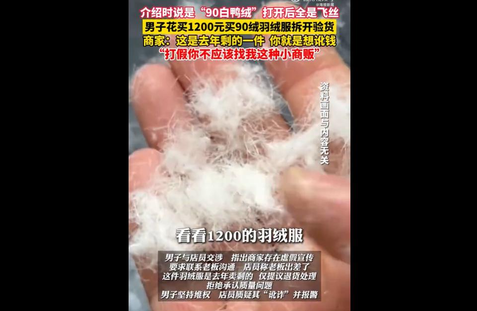 ) 安徽亳州一男子花 3000 余元在 “四小姐” 服装店买多款标注 “90 白鸭绒” 的羽绒服,拆开后发现是飞丝,与店员交涉遭拒还被指 “讹诈”,店员报警并称打假不该找小商贩。 这波 “千元羽绒服变塑料飞丝” 太坑人! 商家把飞丝伪装成 90 白鸭绒,高价售卖还倒打一耙说顾客讹诈,简直是 “挂羊头卖狗肉” 的升级版。 小商贩不是售假挡箭牌,虚假宣传就是侵害权益。 网友吐槽得在理,买羽绒服可得擦亮眼睛,别被 “高标价” 迷惑。 遇到这种情况就得硬气维权,留存证据怼回去,让不良商家知道,消费者的钱可不是好骗的,诚信才是生意的底线!