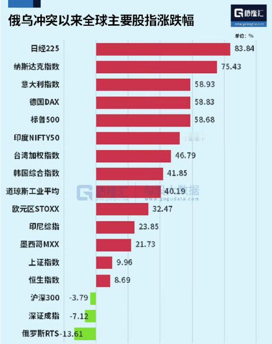 谁是俄乌战争的受益者? 如果我们单纯从资本角度来看,我们就看看全球各地的股市指数来走势,从2022年年初俄乌战争开始至今,哪些地方的股市指数涨幅最大,哪些地方就是最受益的。 从下面这个图中可以看到,日经指数、纳斯达克指数、意大利指数、德国指数、标普指数、印度NIFTY等涨幅超过50%,这些指数的上涨看似和俄乌战争没有关系,但实际上还是有关联逻辑的。 实际上,俄乌战争爆发之后,随着双方武器消耗越来越大,大量武器生产需求拉动了美国、日本、意大利、德国等地方的军工生产,特别是像日本,因为跟随美国支持乌克兰,所以获得了很多美国的武器生产许可,对日本的拉动是非常大的,这也是为什么这几年日本右翼势力越来越活跃,因为他们想要突破战败国的诸多限制条款。