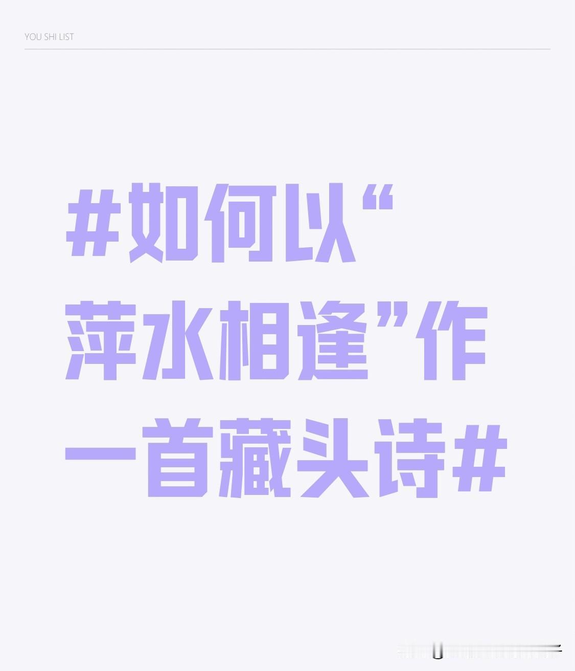 以“萍水相逢”作藏头诗挺有乐趣的。比如有“萍日不为父老倾,水碧沙明两岸苔。相门出相光青史,逢著澄江不敢咏”,每句首字连起来就是“萍水相逢”。 想创作的话,得先明确主题和情感基调。要是表达友情,可像“萍踪偶聚意情浓,水畔同游笑语融。相念时光心互系,逢缘携手乐无穷”。若为感慨人生际遇,“萍浮四海各西东,水逝流年梦影匆。相忆前尘多少事,逢时聚散似飘蓬”。灵感不足时,也可借鉴前人诗作,像许浑与秀才萍水相逢题的诗,从他那优美意境里找创作灵感。