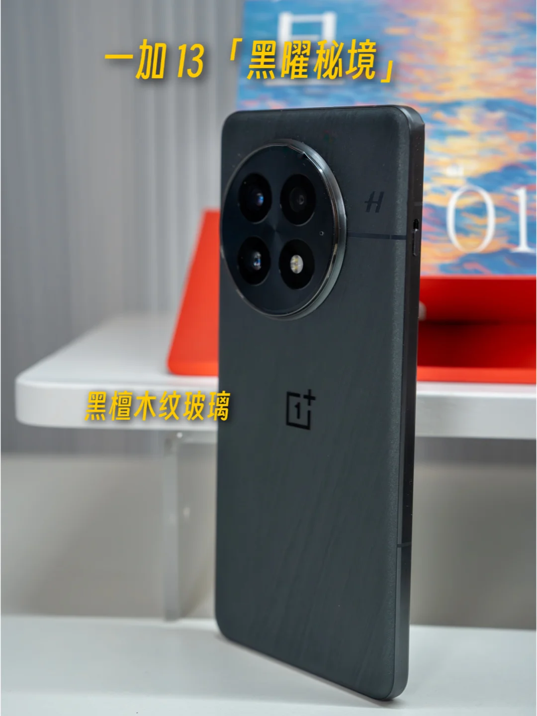 一加 13 「黑曜秘境」背板采用黑檀木纹玻璃,而且不沾染指纹,厚 8.5mm 边框不割手,手感和质感兼具。影像方面一加13这次升级了潜望长焦,加上哈苏超光影旗舰三主摄,无论人像、风景都可以驾驭。
