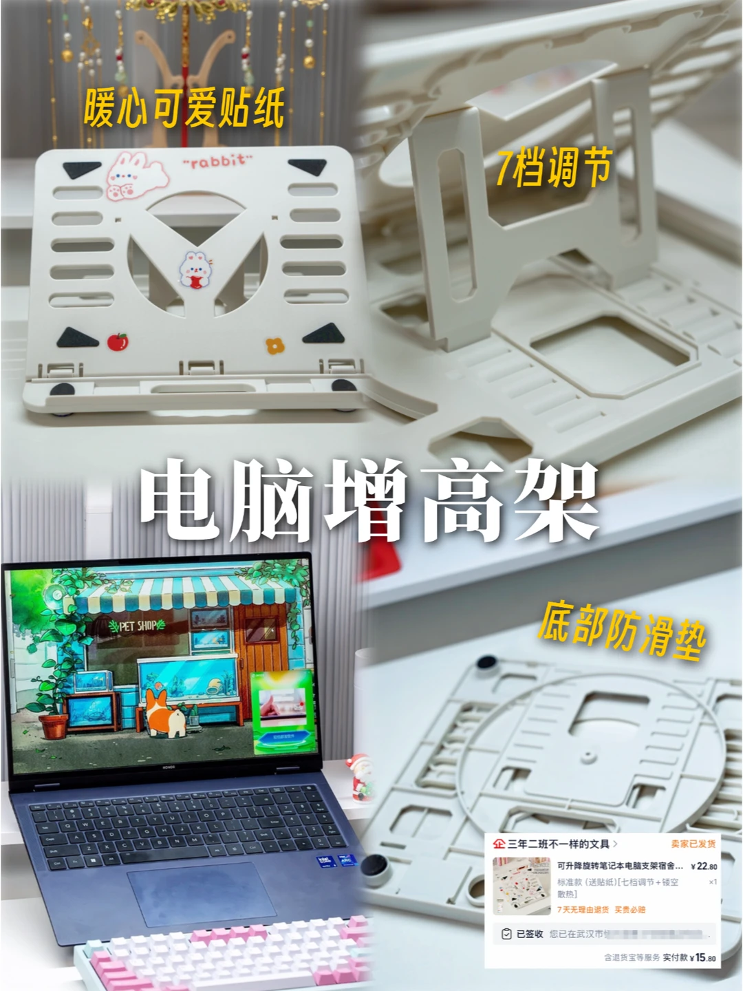 搭配升降桌很好用,在工作台办公的时候可以拯救脖子,避免长时间盯着屏幕脖子酸痛,底部有防滑贴不用担心笔记在桌面上滑动。