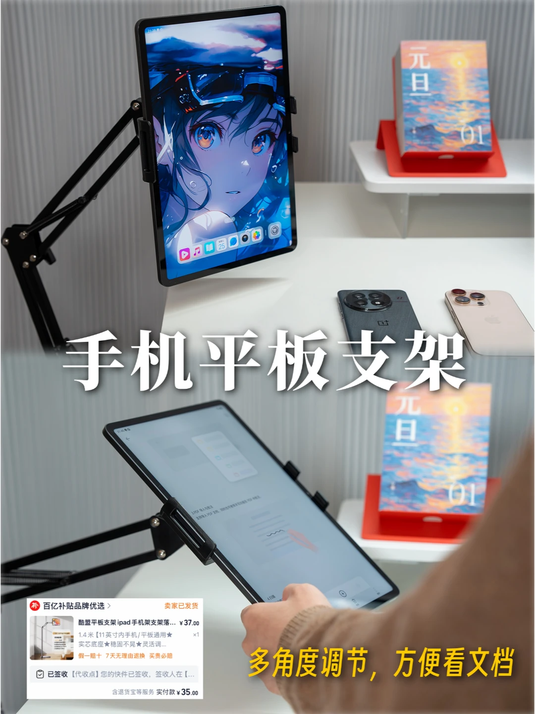 日常办公的时候经常需要平板电脑协助看一些文档或者图片,买一款立在地上可以随意升降调整角度的支架就很好用,根据自己需求调节,想在桌子上拍产品开箱也可以用这个支架,夹手机俯拍桌面。