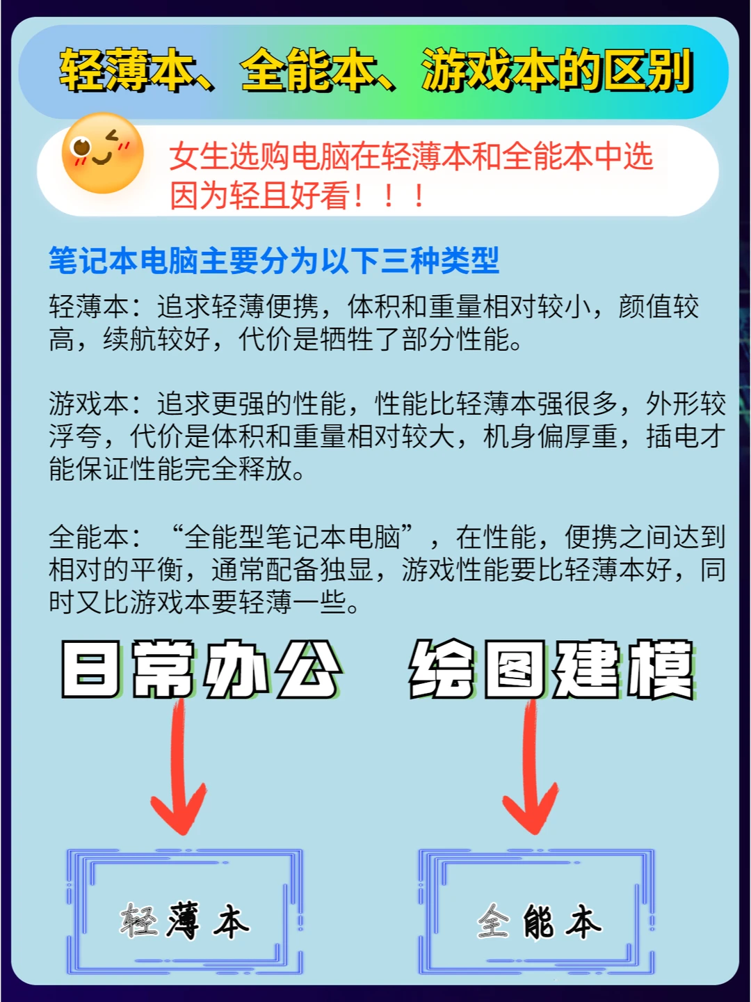 全能本适合主办公,且工作任务较复杂,对笔记本性能要求较高,希望工作之余可以玩玩游戏(对游戏体验要求不高)的人群。