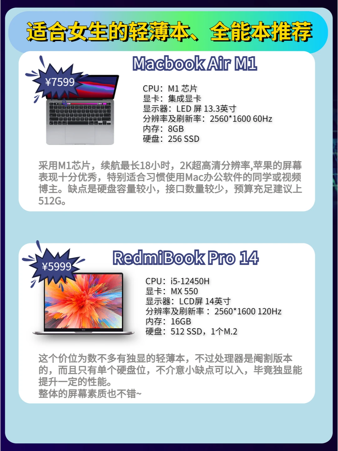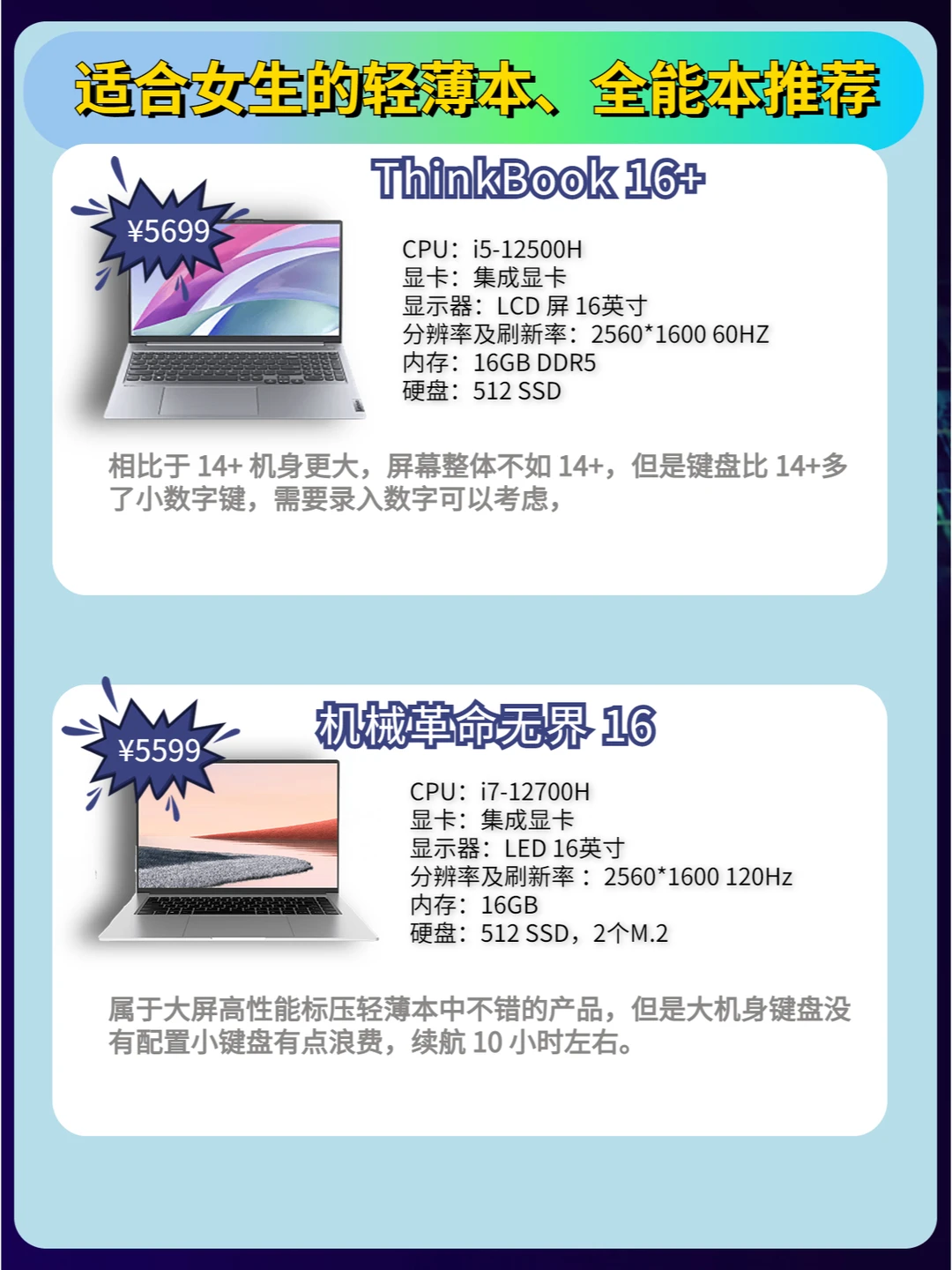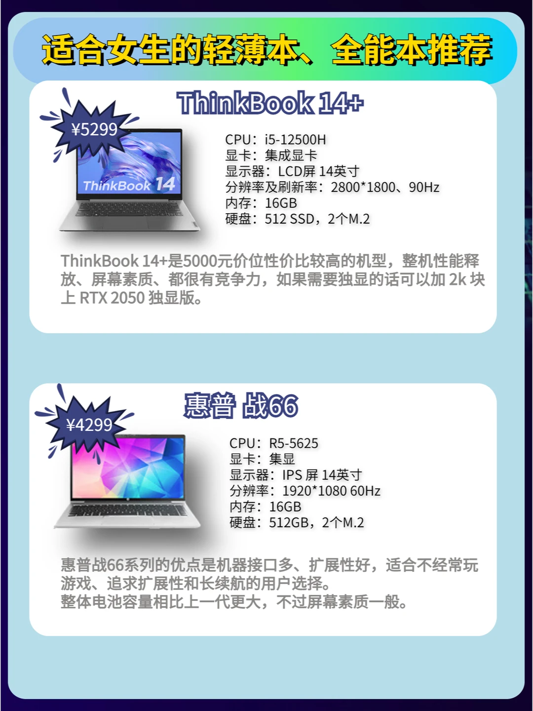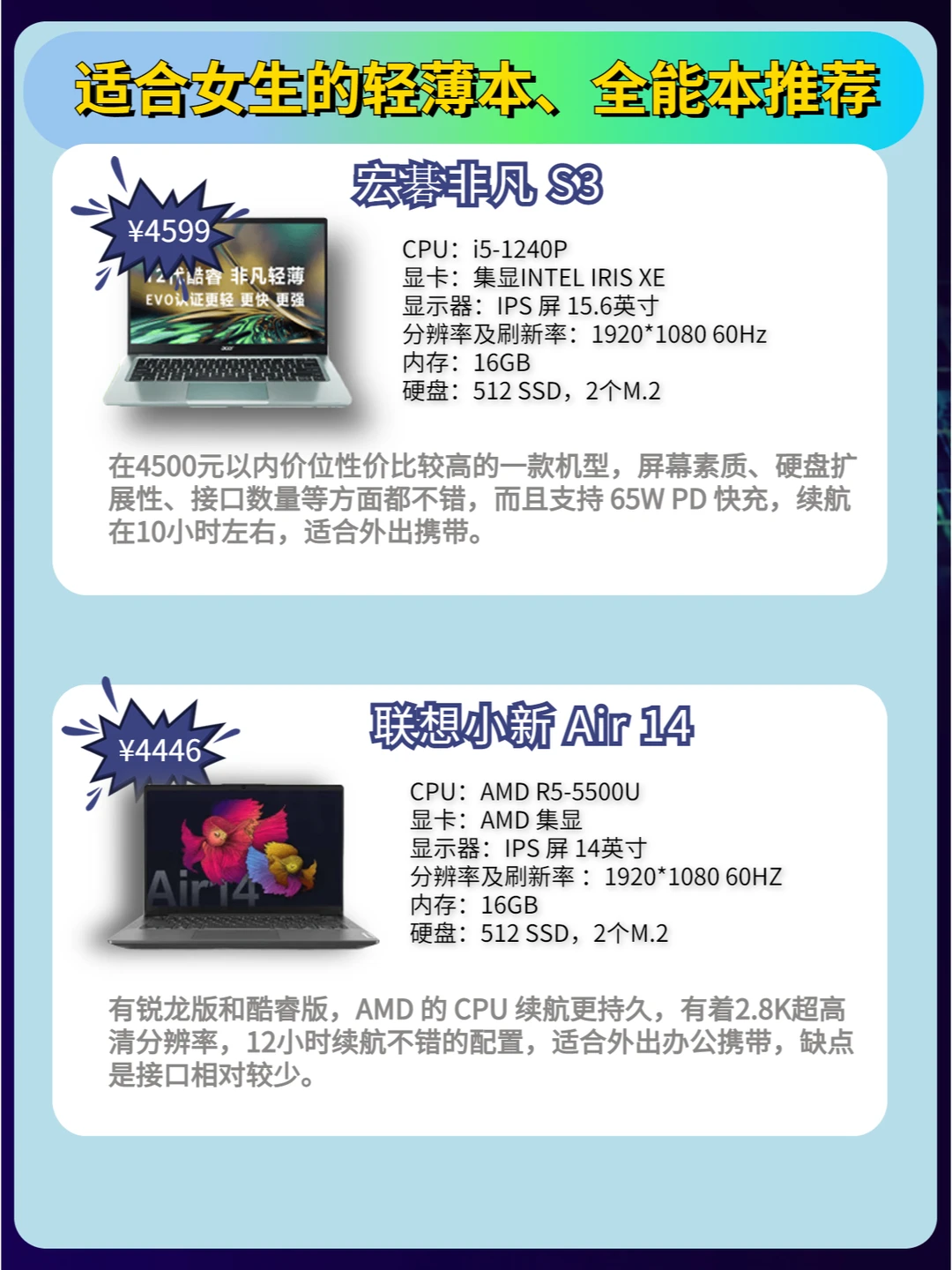 哈喽姐妹们,之前推荐过一期轻薄本推荐反响还不错,这次笔记加上了全能本,女孩子选购电脑在轻薄本和全能本中选,因为轻且好看!!!