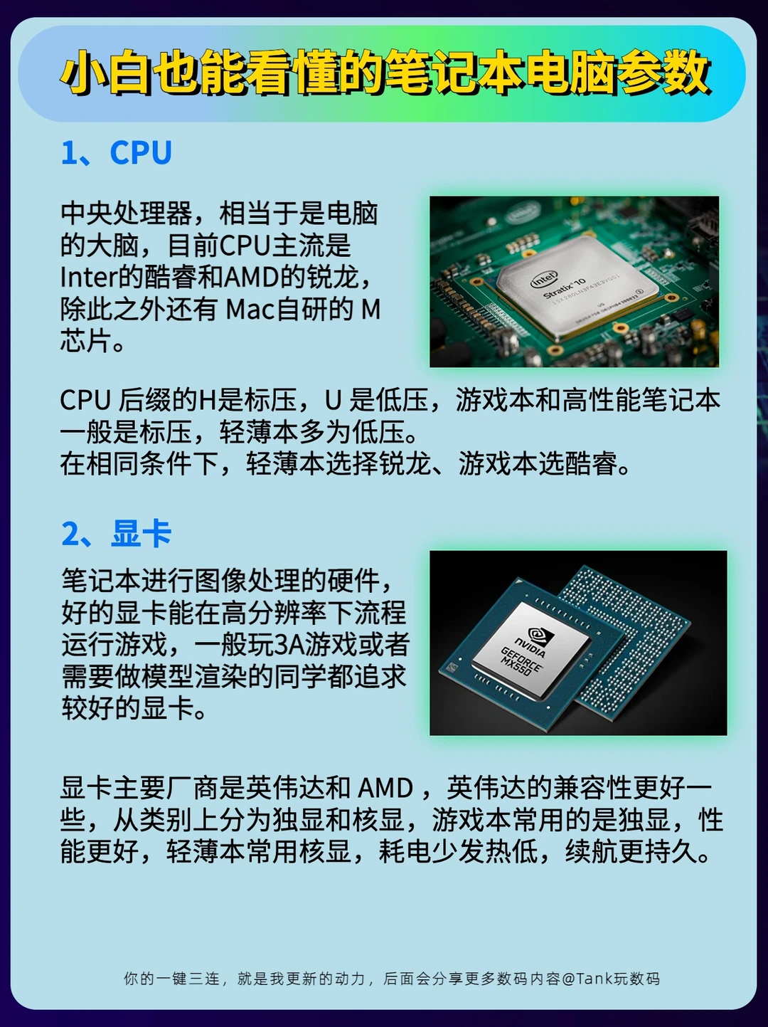 笔记本进行图像处理的硬件,显卡主要厂商是英伟达和 AMD ,游戏本常用的是独显,轻薄本常用核显。
