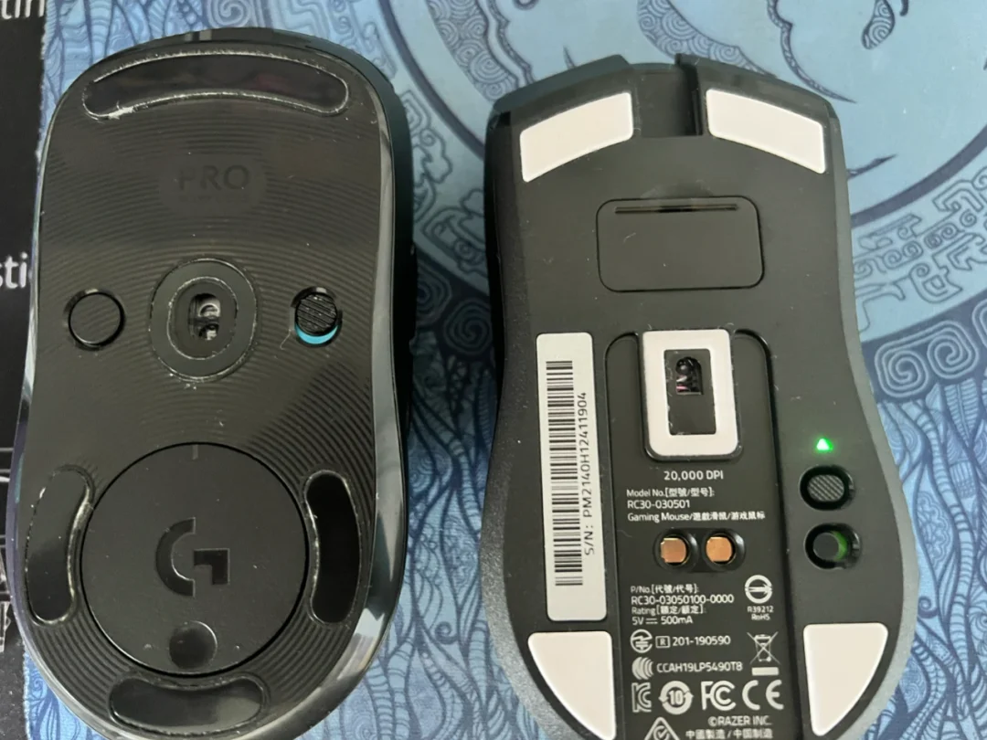 🌟底部都有对应的防滑垫,不过 gpw 底部除了防滑垫之外底壳是防滑纹路设计的,雷蛇毒蝰终极版不是,我在用的时候能稍微感受到 gpw 的定位效果更好一些,在鼠标垫上不容易划出去。
