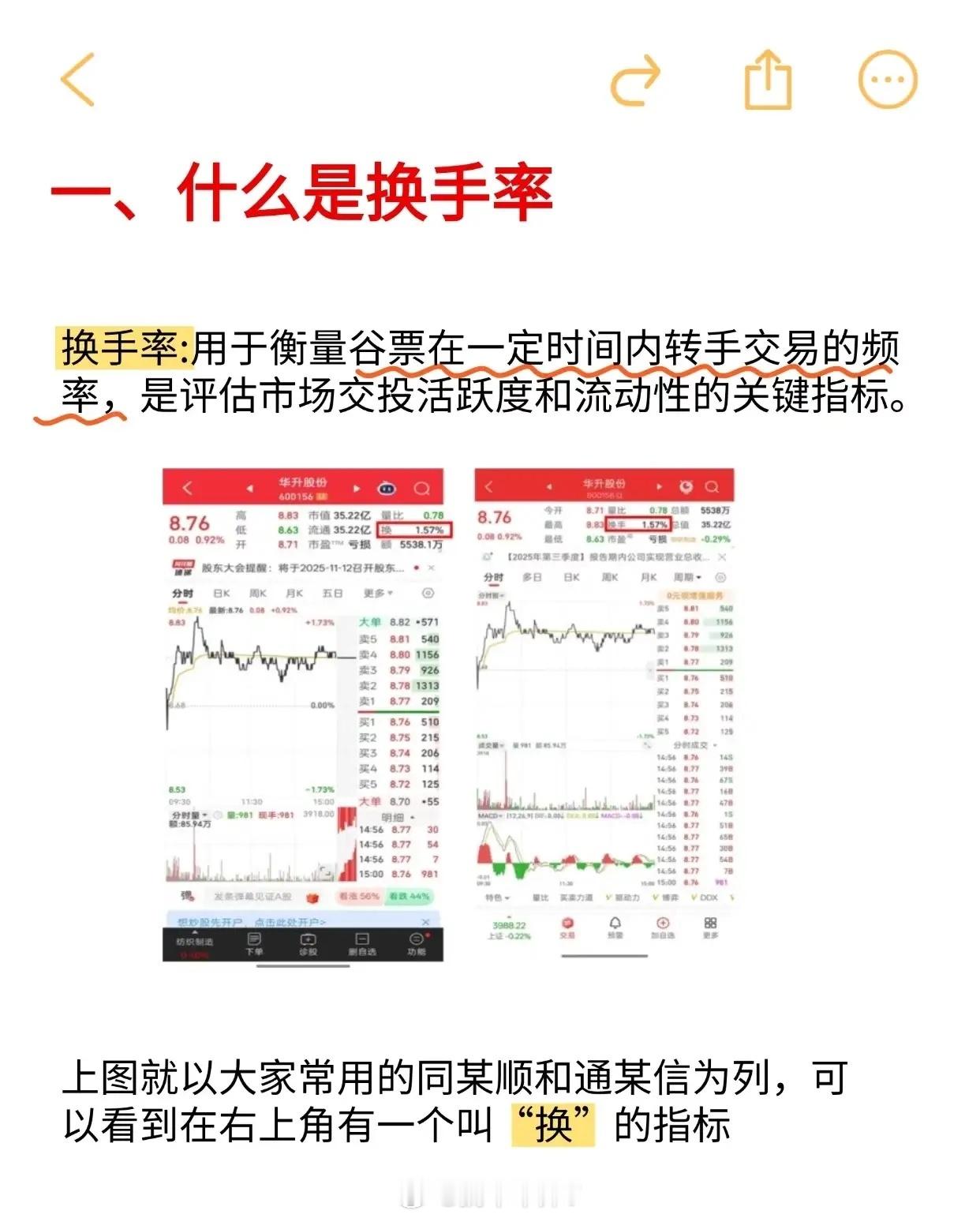 “换手率”这一股票投资关键指标,核心是为散户提供通过换手率判断主力资金动向的方法。第一张图以简洁设计点明主题:散户想知道主力在哪,只需看“换手率”——“换手率”被黄色高亮突出,“散户”“主力”分别以蓝、绿不规则背景区分,直观引导关注这一指标。第二张图解释“什么是换手率”:它是衡量股票一定时间内转手交易频率的指标,用于评估市场交投活跃度与流动性(“换手率”三字黄底突出);并以同花顺、通达信软件截图为例,展示界面右上角“换”指标及华升股份等实时数据,让定义更具象。第三张图讲“换手率有什么用”:一是寻找热门股票——热门股换手率必高,主力需高换手率才有操作空间,且主力卖出也依赖换手率(部分内容黄底标注);二是判断后续走势——通常以3%作为股票是否活跃的分界线,可据此留意股票动态。第四张图深入分析不同换手率的意义:换手率超15%说明股票高度活跃,若股价低位可能是庄家吸筹酝酿拉升;超25%且股价高位则是庄家派发信号(因高换手率难长期维持);还列出按换手率区间划分的状态、盘口观察、资金介入、操作策略及走势趋向(虽表格未完全显示,但关键区间逻辑清晰),并补充需结合股价位置判断,低位高换手率拉升概率更高。第五张图总结注意事项:换手率可量化活跃度,但仅为经验参考,需结合市值、流通股本(如银行股换手率常不足1%,不能套用通用标准);更符合实际的方法是参考近期换手率(对比历史上涨、低位时的数值)判断活跃程度,同时结合其他指标或趋势线提升准确性。整体从“是什么—有什么用—不同数值的意义—实际应用注意”层层递进,帮散户理解如何通过换手率追踪主力动向。
