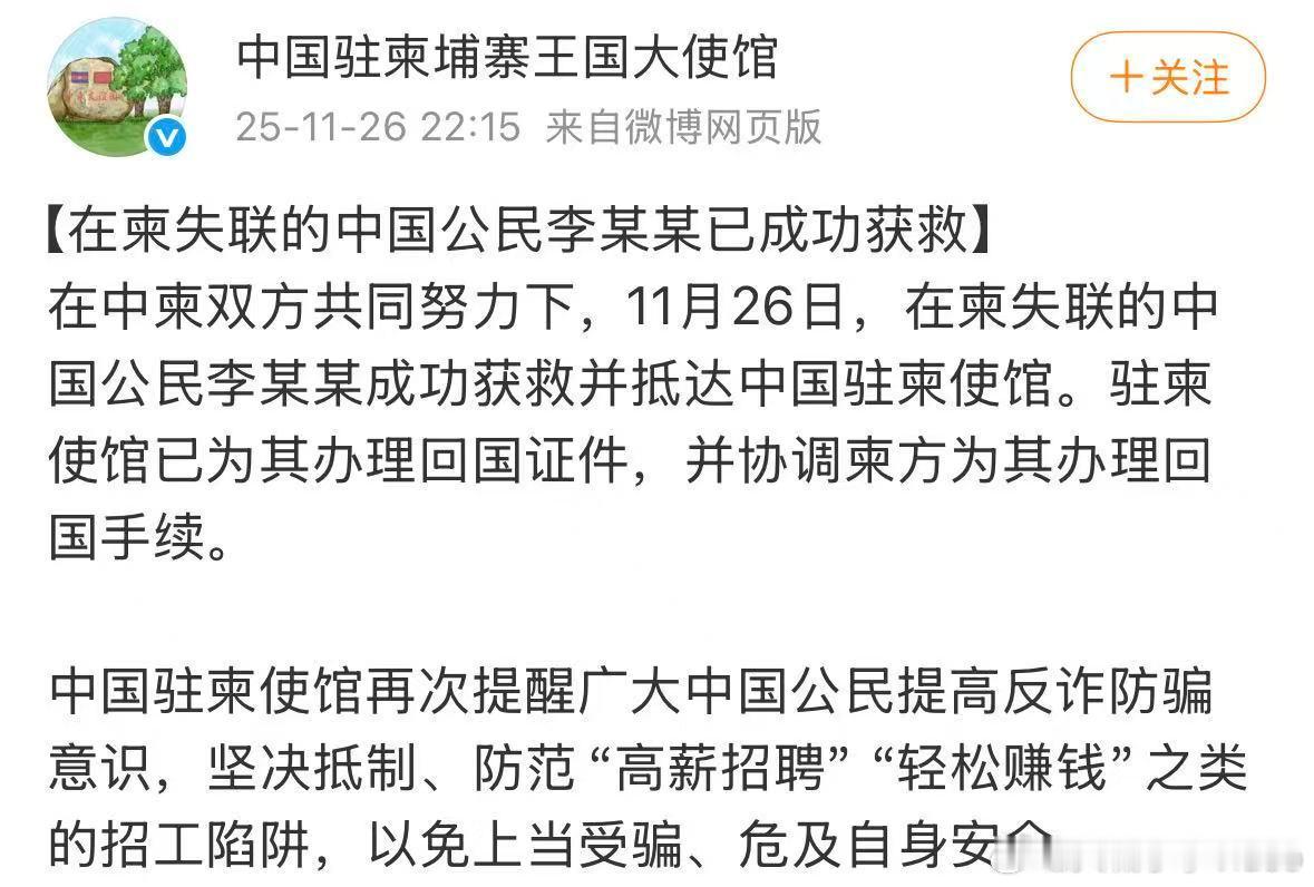 【仝卓表弟已抵达中国驻柬使馆】仝卓表弟已办理回国证件 11月26日晚间,发文:在中柬双方共同努力下,11月26日,在柬失联的中国公民李某某成功获救并抵达中国驻柬使馆。驻柬使馆已为其办理回国证件,并协调柬方为其办理回国手续。中国驻柬使馆再次提醒广大中国公民提高反诈防骗意识,坚决抵制、防范“高薪招聘”“轻松赚钱”之类的招工陷阱,以免上当受骗、危及自身安全。