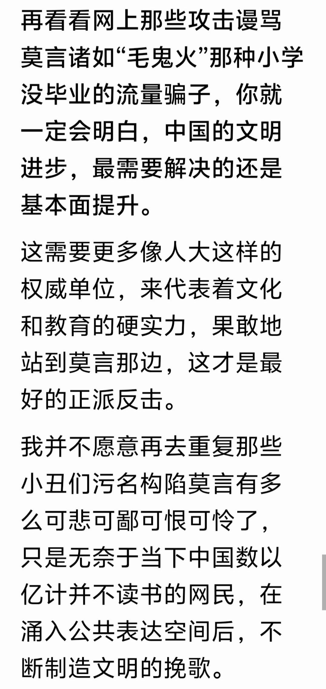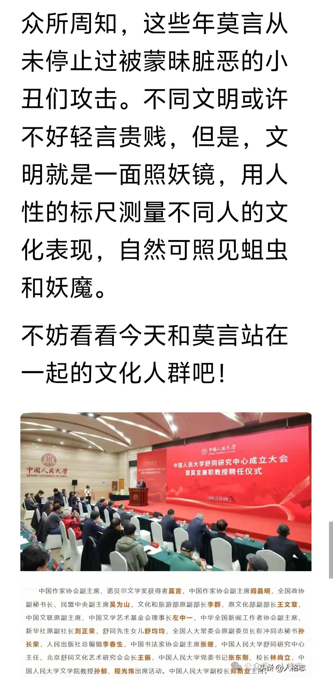 莫言当名校名誉教授,某粉丝情感大爆发,猛捧莫言,狂喷批评过莫言的人 莫言被人大聘为兼职教授和舒同研究中心顾问,有个叫“将爷”的欣喜若狂,说看了中国人民大学的官宣,他“有一种莫名的感动,有一种很解气的感觉”。 于是乎,“将爷”在猛赞莫言之余,把批评过莫言的人狠狠辱骂了一番。他称批评莫言的人为“攻击莫言的蒙昧脏恶的小丑们”,“蛆虫和妖魔”,“那种小学没毕业的流量骗子”,“并不读书的网民”。 作家写下作品,别人发表看法,这是正常的文学批评,怎么莫言及其所谓魔幻现实小说,就成了老虎的屁股摸不得呢?为什么批评莫言,就惹得“将爷”大动肝火,恼羞成怒,对批评者充满仇恨,要用“小丑”、“蛆虫和妖魔”、“骗子”来描述,要以无端的揣测贬低别人的阅读量和学历?都是小老百姓,何以要如此敌视和恶语相加? 答案在于,“将爷”看到莫言与几个文化界领导和著名文化人在一起的照片,自豪地说∶“不妨看看今天和莫言站在一起的文化人群吧!”从其得意之情看,认知逻辑是,和领导、名人一起照相的,就是高人一等的人,文明人。同时,“将爷”似乎把自己也归于莫言一类。而批评莫言的人,在他眼里就属于低级的、没文化的人,就是可以随意辱骂的对象。 “将爷”的文明就是自称“将爷”。然而,事实恐怕是,除了他家里的老老小小,他给外面的谁都当不了爷。 “将爷”说,“只是无奈于当下中国数以亿计并不读书的网民,在涌入公共表达空间后,不断制造文明的挽歌”。在此想问问自诩文明人、文学内行的“将爷”,你跑到公共表达空间,用恶毒的语言、莫须有的罪名诋毁他人,难道就是在制造文明的赞歌?