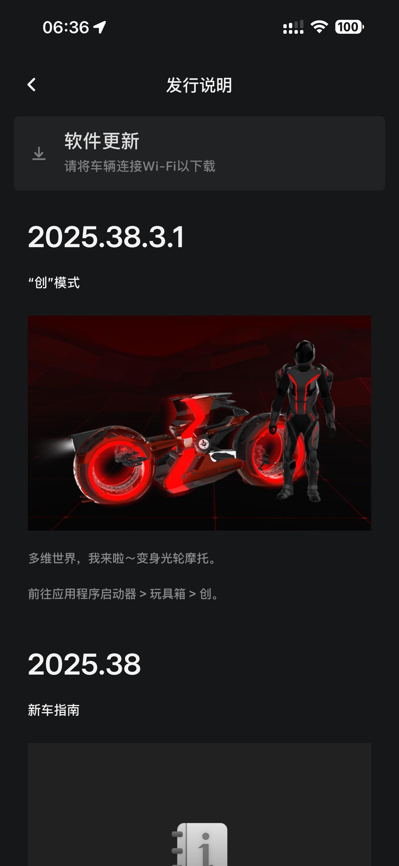 终于收到特斯拉最新版本更新了! 现在最新版本是2025.38.11版本,我是6月份买的焕新Model Y。之前一直看别人的汽车收到更新,以为只是给老款车主推送。 没想到今天早晨打开手机,直接收到特斯拉新版本推送,这个新版本有一个创模式,非常炫酷的特效。 车机上汽车模型直接变为红色的摩托车,而且还配有音乐和氛围灯,可以说是相当的炫酷。更新也就这个功能明显一些,其他功能只是修复吧。 一会更新试一下!
