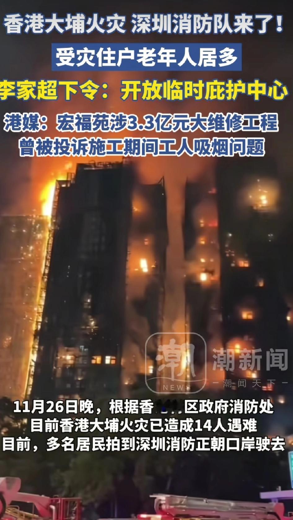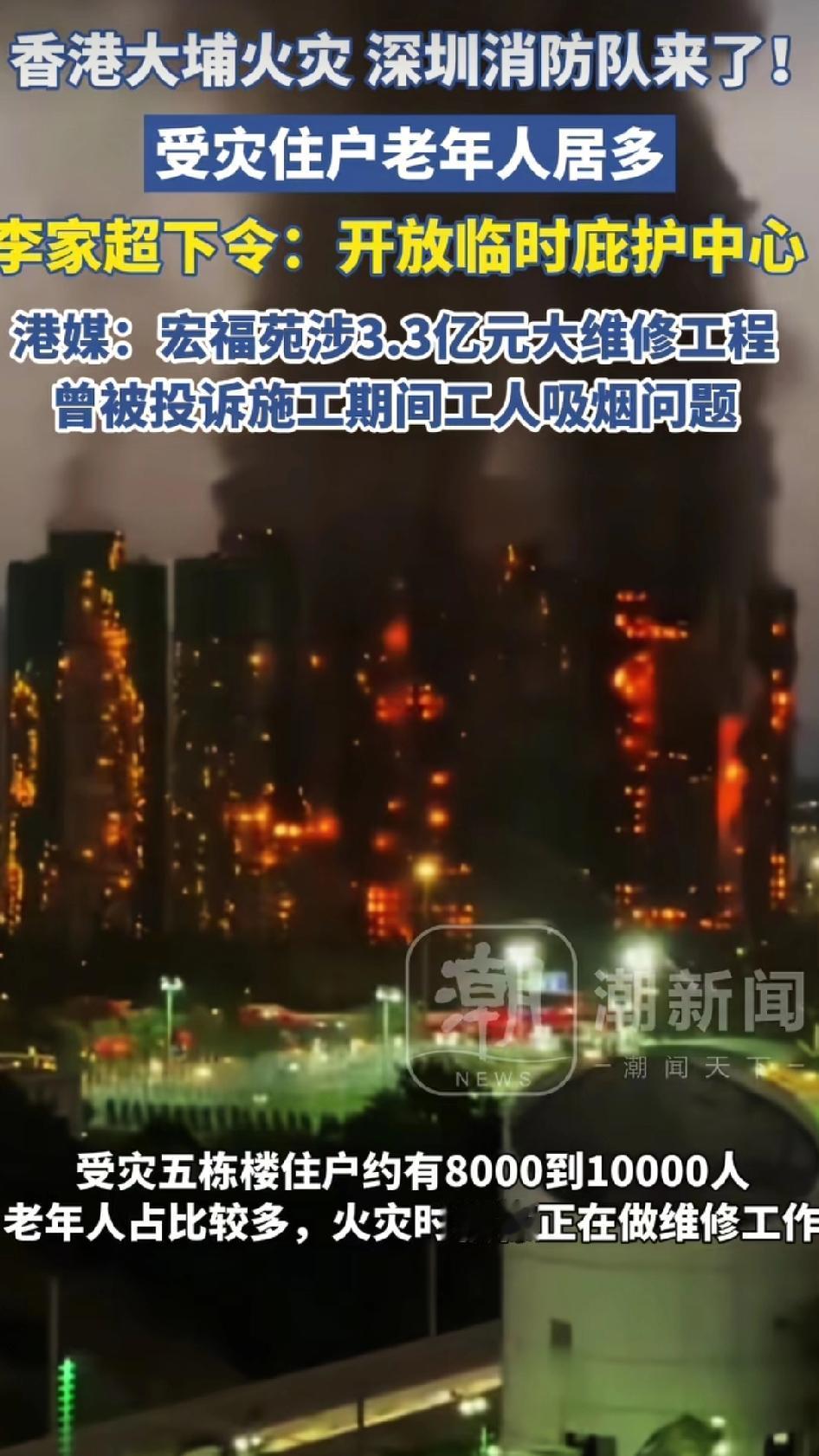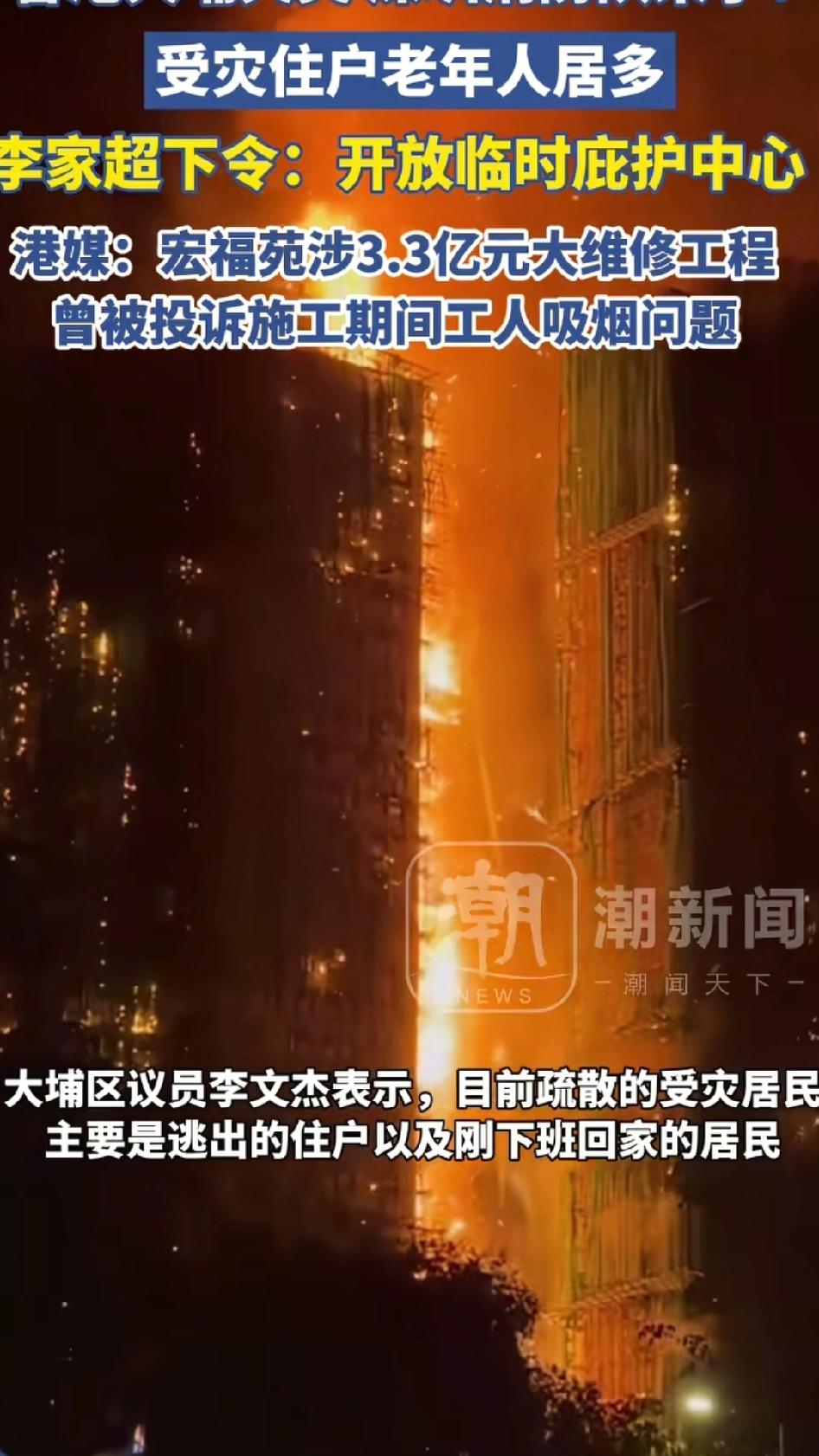 宏福苑的8座大厦正在进行升级维修,主要是修理外墙,外墙搭有竹制的脚手架、棚网、外墙保护膜、发泡胶等,一些不符合防火标准的材料是极易燃烧的,火势从1栋楼借着风势传到另外7栋楼,使得整个宏福苑都陷入大火之中。 整个救援香港地区总共出动了140多辆消防车,60多辆救护车,出动800多名消防员以及医护人员,400多警察,针对高层建筑,动用了消防梯以及无人机。 值得称道的是,香港特区政府启用了8个避难所,还开通了寻亲热线,另外,香港特区各种关爱队以及一些心理学家也参与了支援,还有一些民众担任志愿者负责送物资等相关工作。 目前已经有三名人员被以误杀罪逮捕,含两名董事,一名顾问。