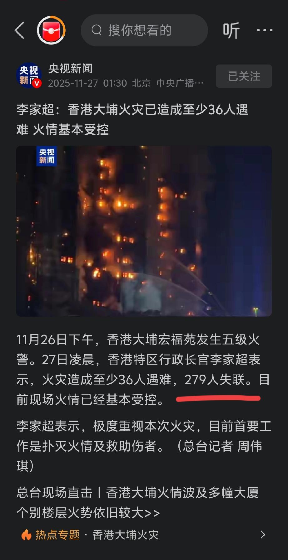 香港大埔宏福苑火灾,遇难人数升至36人,279人失联。 火灾原因初步判断: 1. 工程方使用大陆早已淘汰的竹子脚手架(应该使用钢管脚手架)。众多目击者称,看到最先起火的就是脚手架。 2. 大楼里的人在楼梯和过道等违规堆放易起火的杂物。 3. 风太大,火势被吹的迅猛蔓延,酿成火烧连营的惨况。 4. 楼层太高,消防工具不够先进,没有足够大量无人机等灭火。消防云梯也不够高,望火兴叹。 5. 楼间距太小,因此还没买房的朋友,一定要尽量买总高低,楼间距大的。 总结教训,希望各个单位物业严格管理,群众防火要真实演练,不走过场和流于形式摆拍。高龄老宅电器要更新,施工人员动火要有证,尤其是电焊工很关键。 教训是深刻的,希望逝者安息,伤者早日康复,失联者尽快安全回家[祈祷]。 外墙维修中的楼宇为何容易起火 香港 香港大埔发生火灾的原因有哪些