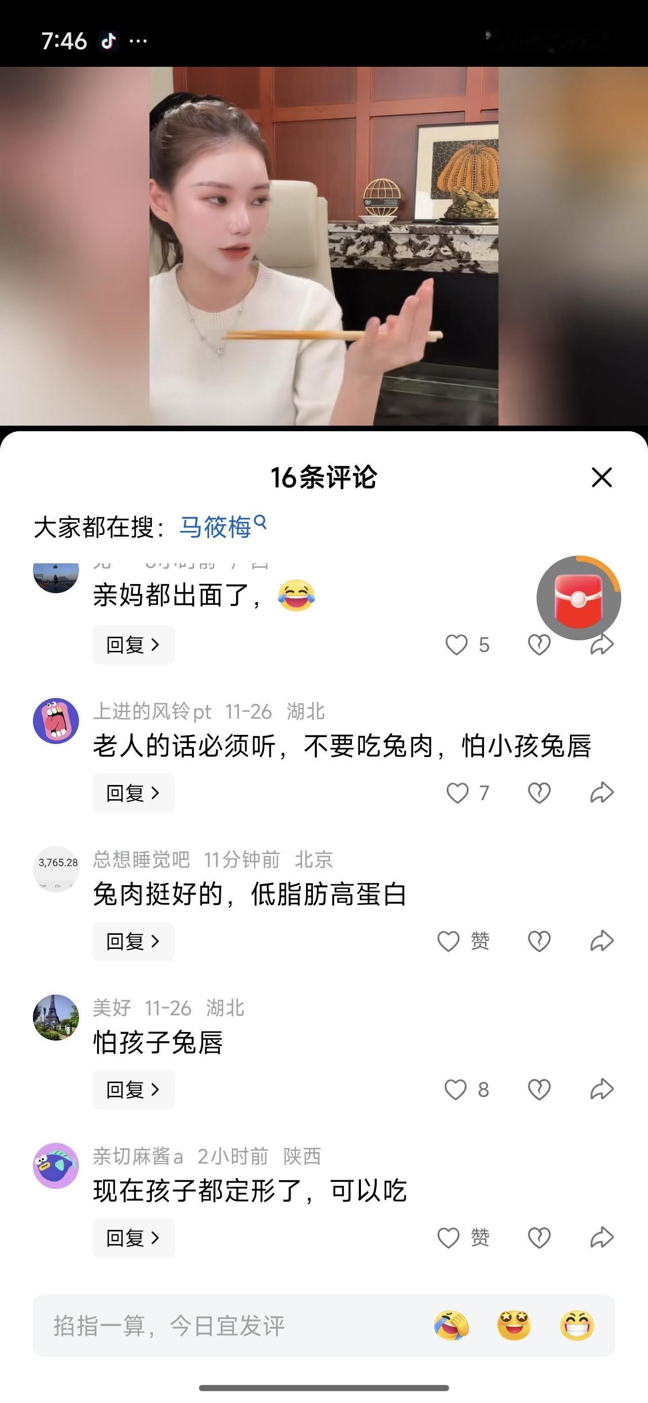 马筱梅这次是真的怀孕了,带货一款兔肉,婆婆和妈妈立马发消息告诉她,不要吃兔肉。民间是有这个说法的,不要吃兔肉,害怕三瓣嘴。 就是唇腭裂么。我家邻居第一胎生的就是唇腭裂儿童,那时候医疗条件不好,活活饿死了。这是我奶奶说的,我们都不知道。都还小。 看来有些说法,大家都是公认的。也有说孩子都定型了,没事,你觉得呢?能吃吗?