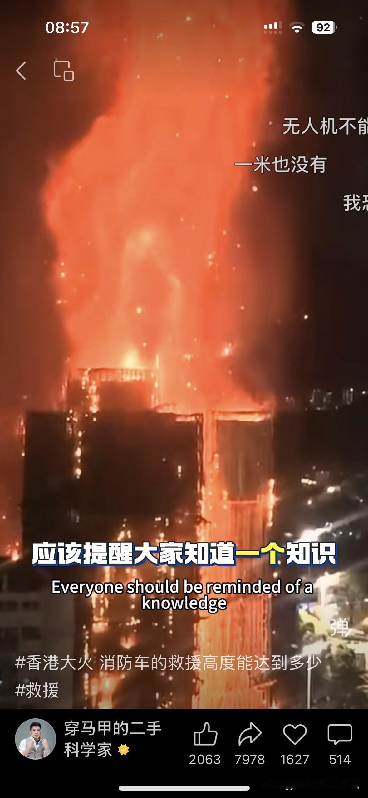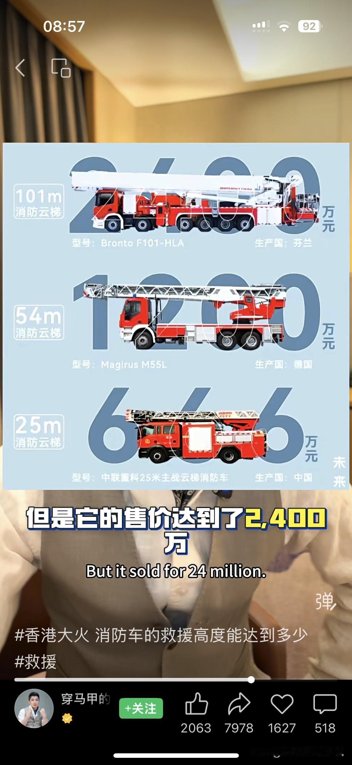 这一次香港大火,真的很可怕,视频里看到一大片火海吞没几栋高层住宅,真的让人落泪惊心! 我们又一次看到真实的情况,普通的消防车一般只能救援到11楼的高度!而能救援到33层楼高度的消防车,价格去到2400万! 而现在每一座城市,高达30层以上的高楼遍地都是!更不要说那些40层、50层、60层的超高层写字楼住宅楼了!