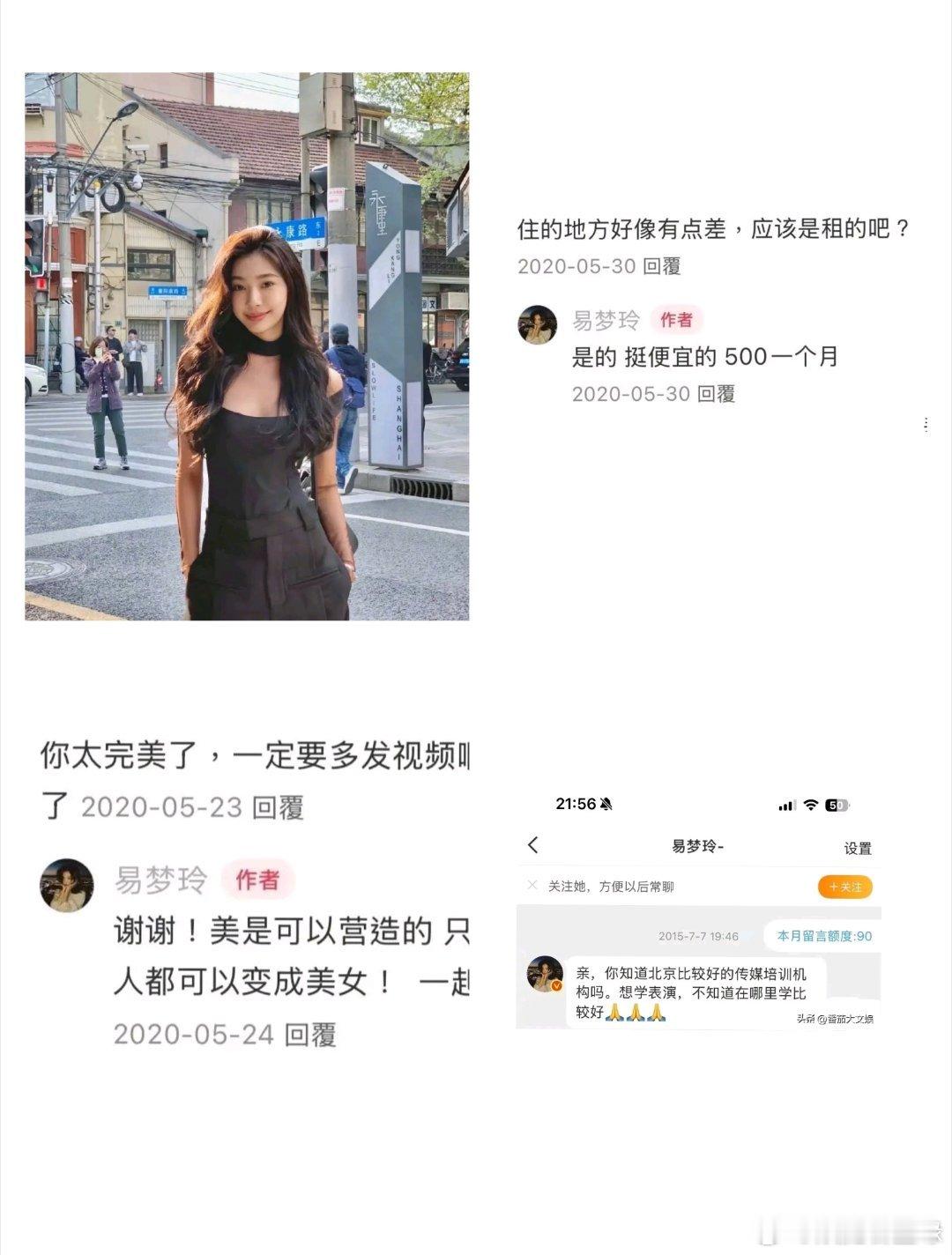 易梦玲10年前私信询问表演培训有网友整理了易梦玲5年前回复的评论,发现易梦玲10年前就想学表演,曾私信询问北京好的培训机构;5年前还在住月租500的房子。从艺考失败到转行做模特,从参加郝蕾的表演培训班到如今出演话剧,易梦玲真的一直有在为自己的梦想努力了!由此可见她是一个非常有上进心的女性,胡彦斌取到这样的女人也是福分啊。