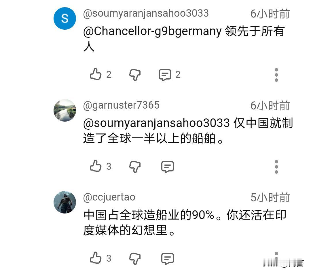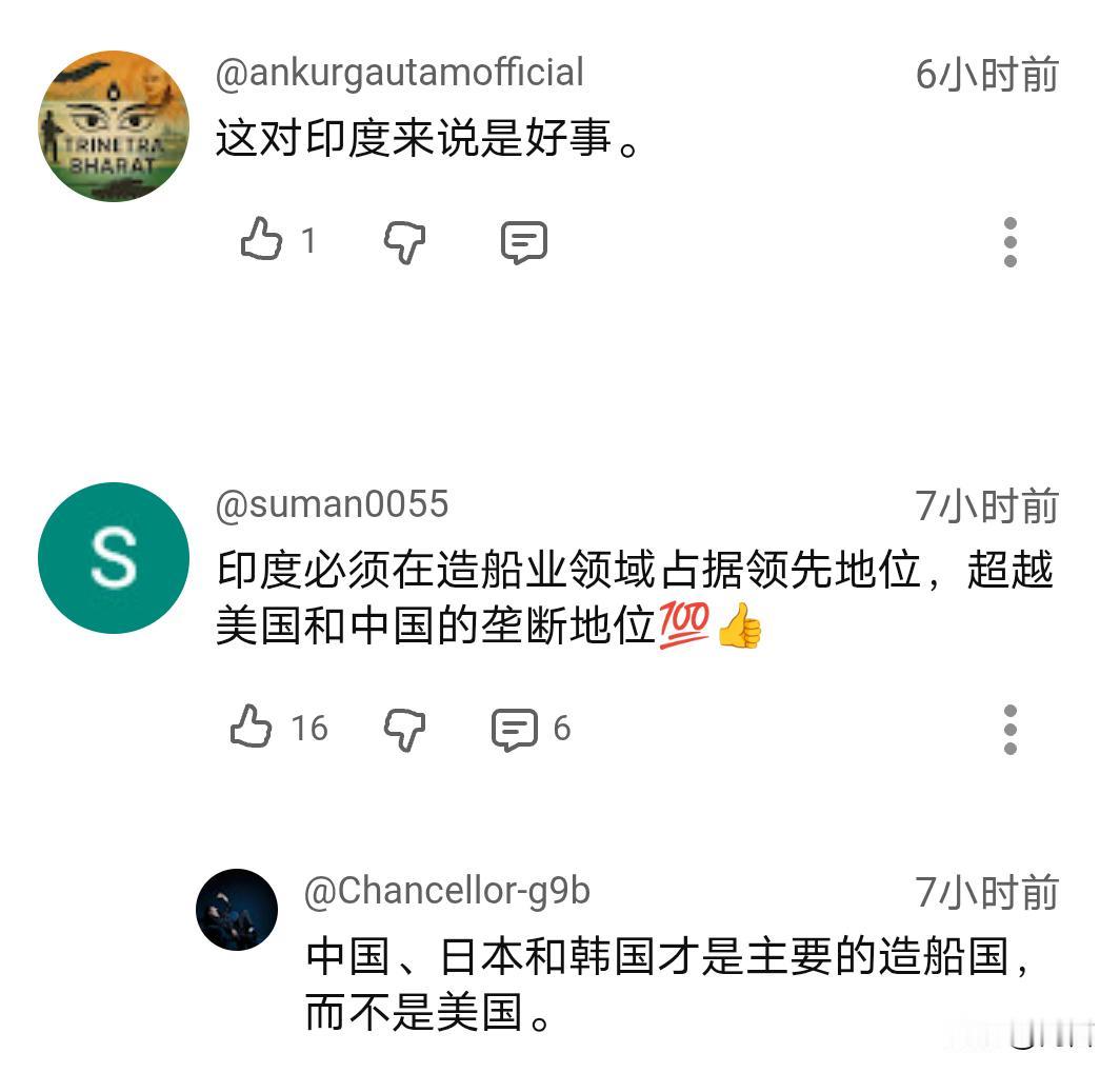 印媒:印度要成为全球造船业的中心。 据印媒11月26日报道,印度斥资数十亿美元大力发展造船业,力求在2047年跻身成为全球五大造船国之一,同时拿下25%以上市场份额。 数据显示,印度目前在全球造船业的市场份额还不到百分之一,仅排名第十六位。市场占比、技术及建造成本与其他的造船业强国相比,都还有较大的差距。例如:同一类型的船舶,印度的船厂的成本,要比中韩两国高出25—30%。 当然,印度也有自己的优势,在船舶维修和回收方面表现突出,占据了全球25%的市场份额。 船舶制造是一项高附加值产业,需要长期的技术积累和投入,印度仅凭现有的优势和基础还是远远不够的。那么,其能成功吗?印度网友给出了肯定的回答…