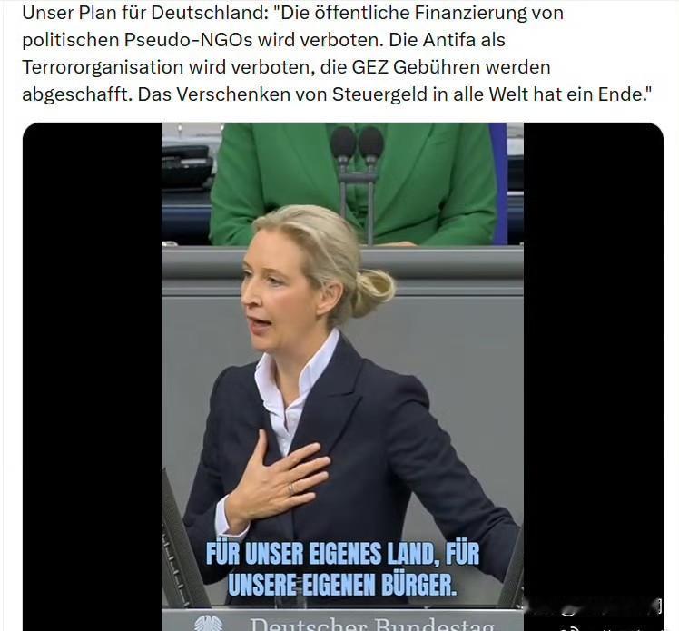爱丽斯·魏德尔: “禁止对政冶伪装成NGO的组织进行公共资金资助。将安提法定性为恐怖组织并取缔,废除广播电视费。停止把纳税人的钱送往世界各地。”